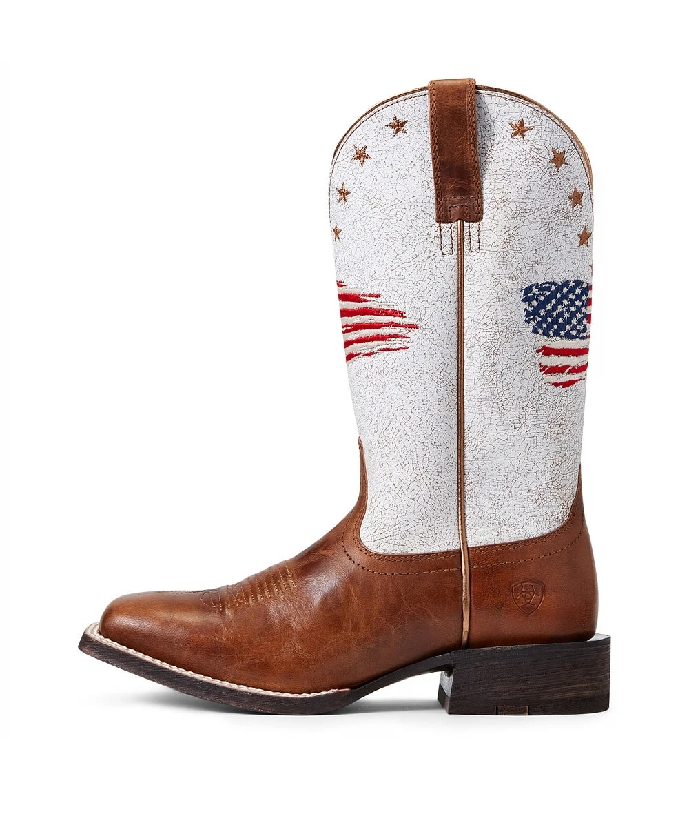 Brown And Crackle White Full Grain Leather; Leather Lining; American Flag And Gold Star Embroidery Design; Removable All Day Cushioning Insole; 4LR Lightweight Stabilizing Shank For Support; Double Stitch Welt; Square Toe; Hand Nailed Distressed Leather Sole; Approved For Riding; Can Be Resoled; Style #10040400