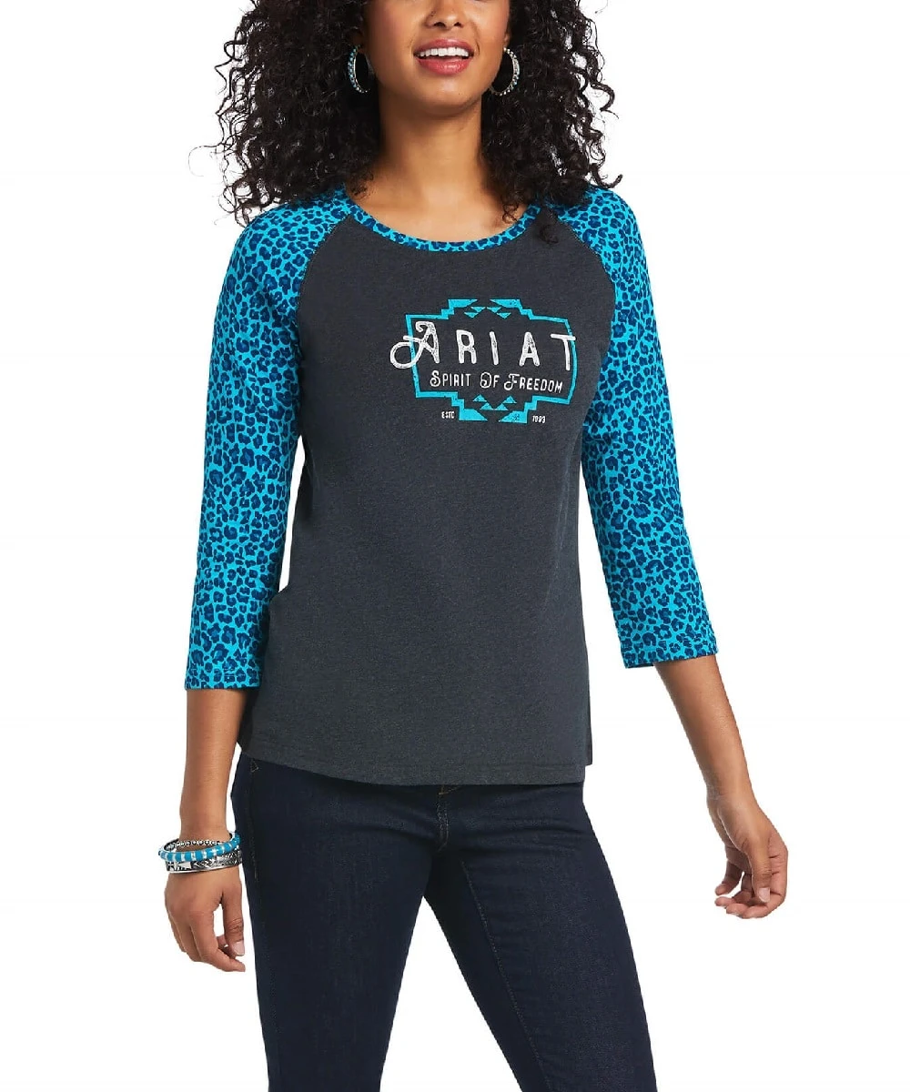 95% Cotton/5% Spandex; Super Soft Jersey; Contrast Turquoise And Black Leopard Print Three Quarter Sleeves; Front Turquoise And White Graphic Tee Southwest Print Reads: Ariat, Spirit of Freedom; Style #10039775