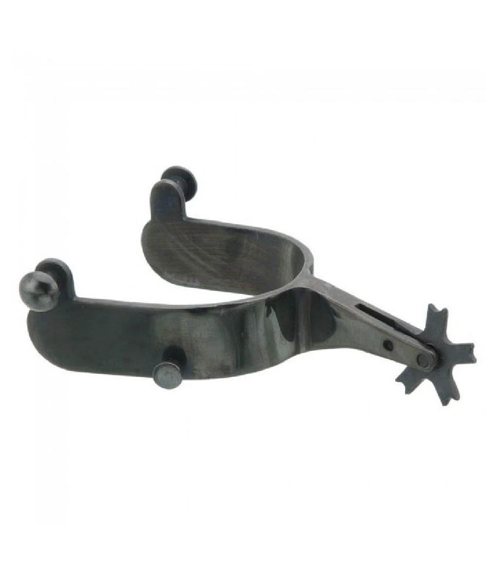 Finished In Gun Metal Steel; Extra Strength And Durability; Solid Buttons; 1″ Band; Bull/Bareback Combination Spurs; 22 1/2 Degrees Offset; 2 1/4″ Shank; 5 Point Rowel; Style #78-8023