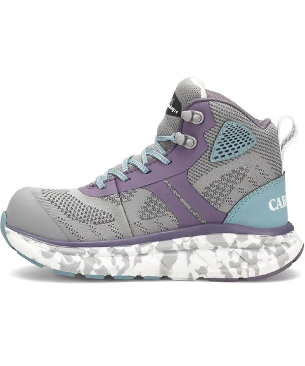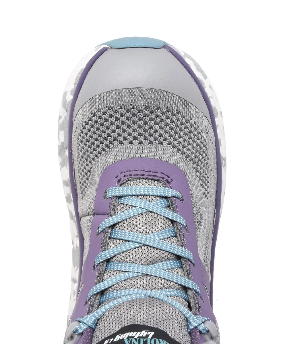 Gray Knit Textile And Purple And Turquoise Synthetic Leather Upper; Mesh Lining; High Rebound EVA Midsole; ALIGN Removable Footbed With Orthotic Insole; Cement Construction; Non Metallic Safety Toe Cap With Reduced Cold Transfer In Cooler Environments; Oil And Slip Resisting Rubber Outsole; Electrical Hazard Rated At 18,000 Volts At 60 Hz. For One Minute Without Leakage; Meets ASTM F2413-18 Impact And Compression Standards; Style #CA1949