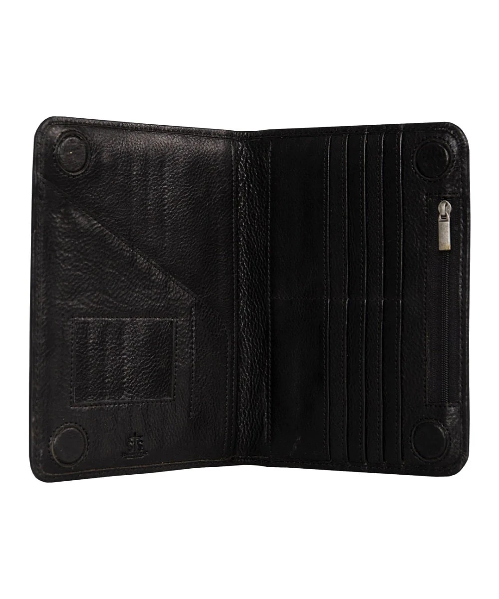 Genuine Full Grain Leather; Color: Black; Measures Approximately: 5.5″ W X 7.5″ H X .75″ D; Stylish Etched Pattern; Magnetic Closure; ID Pocket; Zip Change Pocket; Ten Card Slots; Two Slip Pockets; Style #STS31070