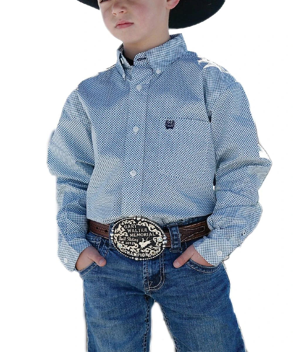 Printed Cotton Plain Weave; Button Down Collar; Button Cuffs; Single Open Pocket With Cinch Embroidery; Cream Buttons; Style #MTW7060268