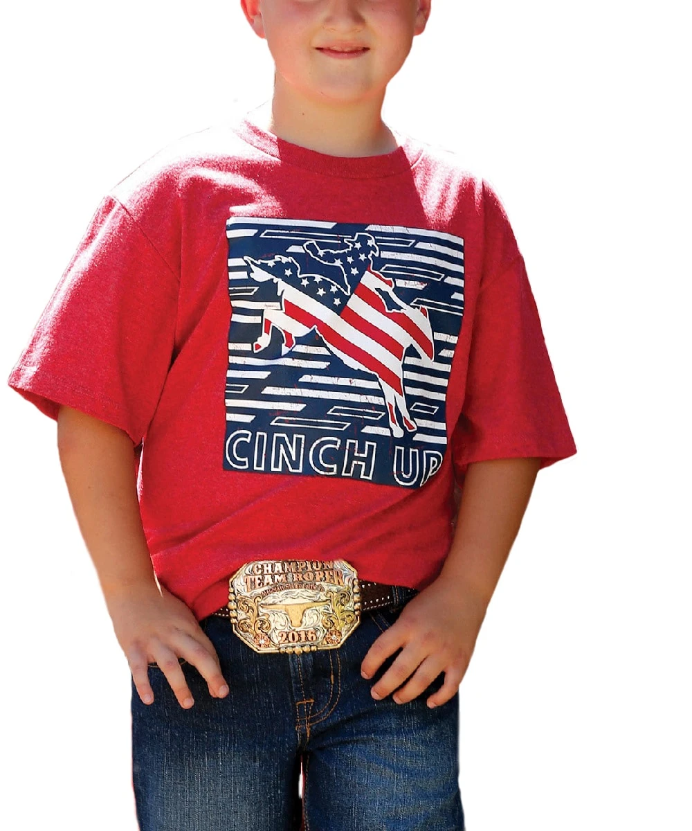 55% Cotton/45% Polyester; Crew Neck; Short Sleeve; Front Red, White And Blue Flag Bronc Rider Graphic Tee Print Reads: Cinch Up; Color: Red; Style #MTT7670118