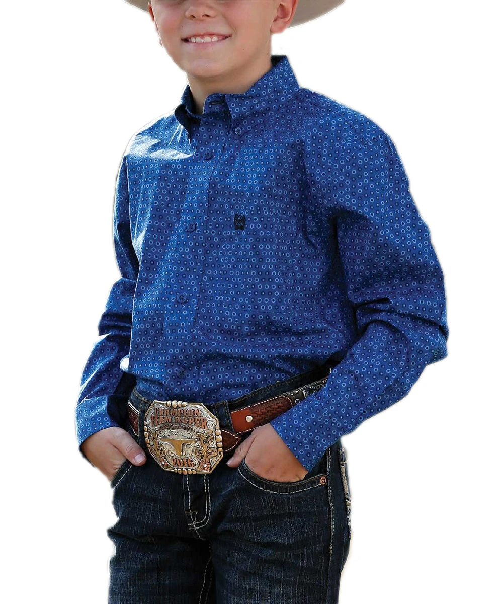 100% Cotton; Button Down Collar; Button Cuffs; Single Open Pocket With Cinch Embroidery; Color: Royal Blue And Black Print; Style #MTW7060260