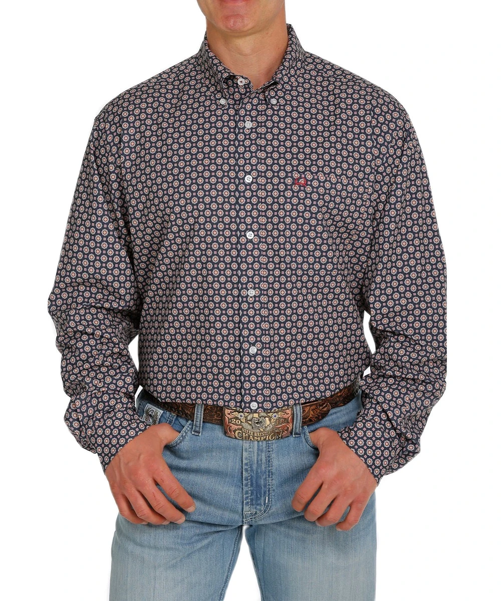 Lightweight Printed Poly-Spandex; Long Sleeve; Button Down Collar; Button Cuffs; Single Open Pocket With Cinch Embroidery; Color: Navy, Orange And Red Medallion Print; Matching Boys’ Shirt #MTW7060285; Style #MTW1862009
