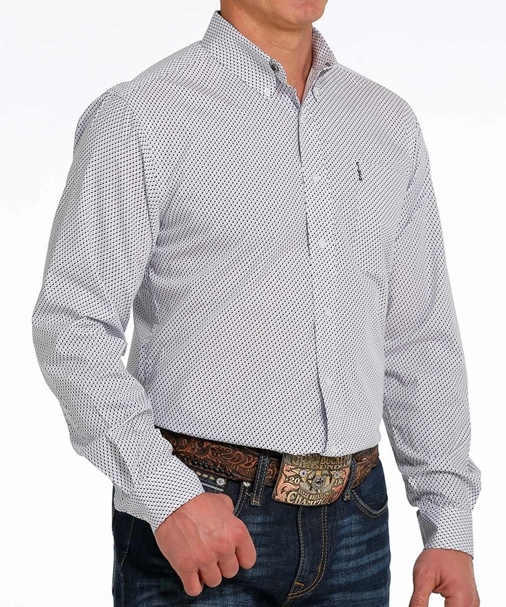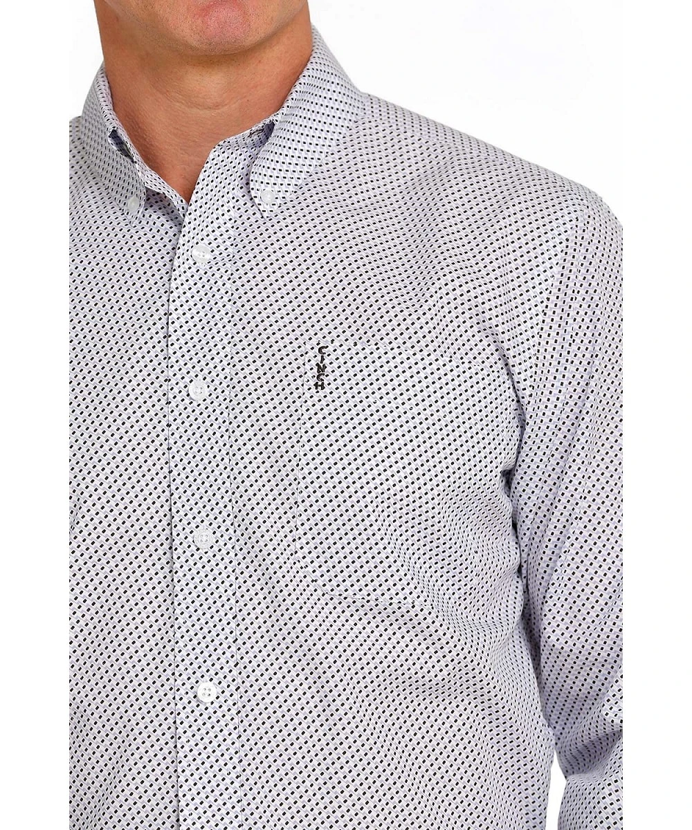 Printed Cotton Plain Weave; Modern Fit; Long Sleeve; Button Down Collar, Placket, And Cuffs; White Buttons; Open Left Chest Pocket With Logo Embroidery; Color: White With Purple Geo Print; Style #MTW1347064