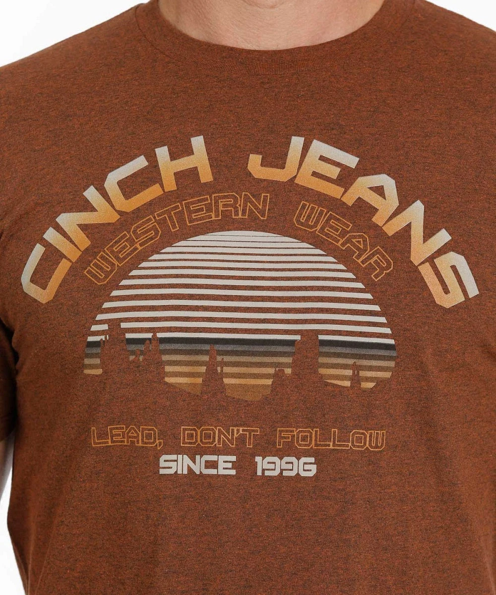 Color: Copper Heather; Crewneck; Sunset Graphic Tee Print With ‘Lead, Don’t Follow’ Cinch Logo; Style #MTT1690461