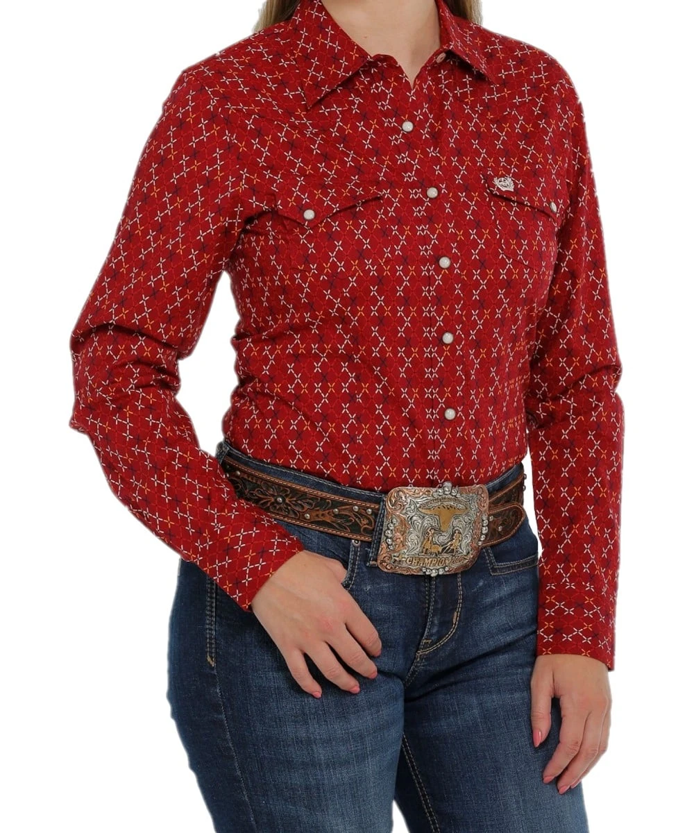 100% Cotton; Printed Plain Weave; Long Sleeve; Spread Collar; Two Snap Flap Chest Pockets With Logo Embroidery; Cream Marble Snap Placket; Two Single Point Western Yokes On Front; Single Point Western Yoke On Back; Adjustable Snap Cuffs; Geometric Print; Color: Red; Style #MSW9201036