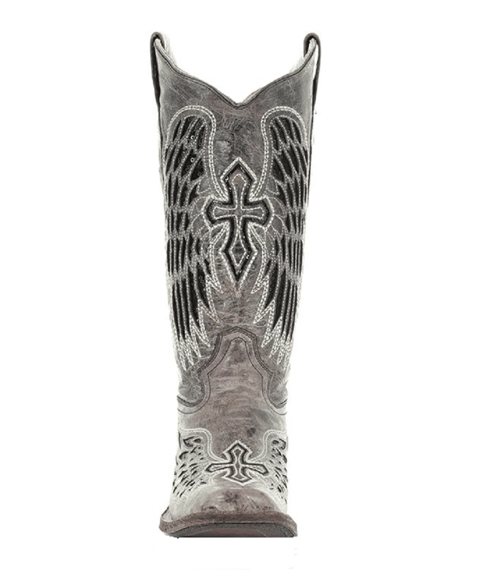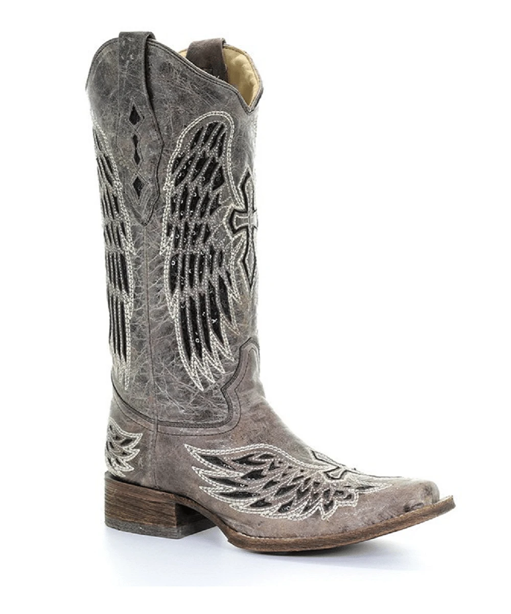 13″ Shaft; Cowhide Leather; Cowhide Leather Lining; Wing And Cross Underlays With Sequin Accents; Goodyear Welt Construction; Square Toe; Stockman Heel; Leather With Rubber Insert Sole; Style #A1197