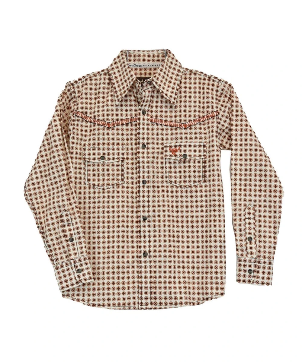 100% Cotton; Long Sleeve; Spread Collar; Snap Cuffs; Two Snap Flap Pockets; Single Point Front/Back Yokes; Accent Stitching On Yoke Seams; Color: Sand/Orange/Black Circle Star Print; Style #725468-083-T