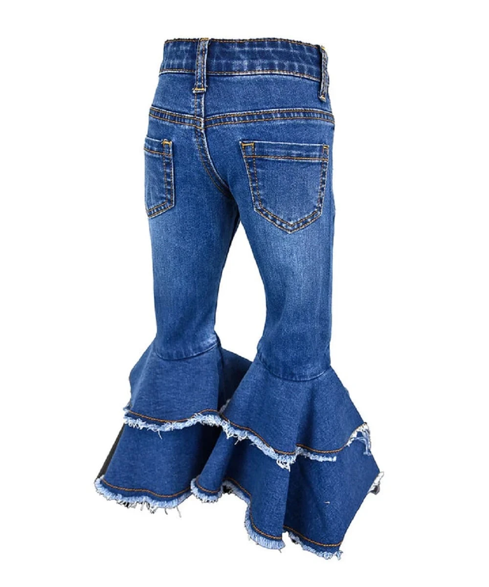 72% Cotton/26% Polyester/2% Elastane; Medium Wash; Adjustable Waist Band; Four Pocket Styling; Fading; Raw Edge Hem; Double Tiered Ruffled Flared Leg; Style #402097-450-JK