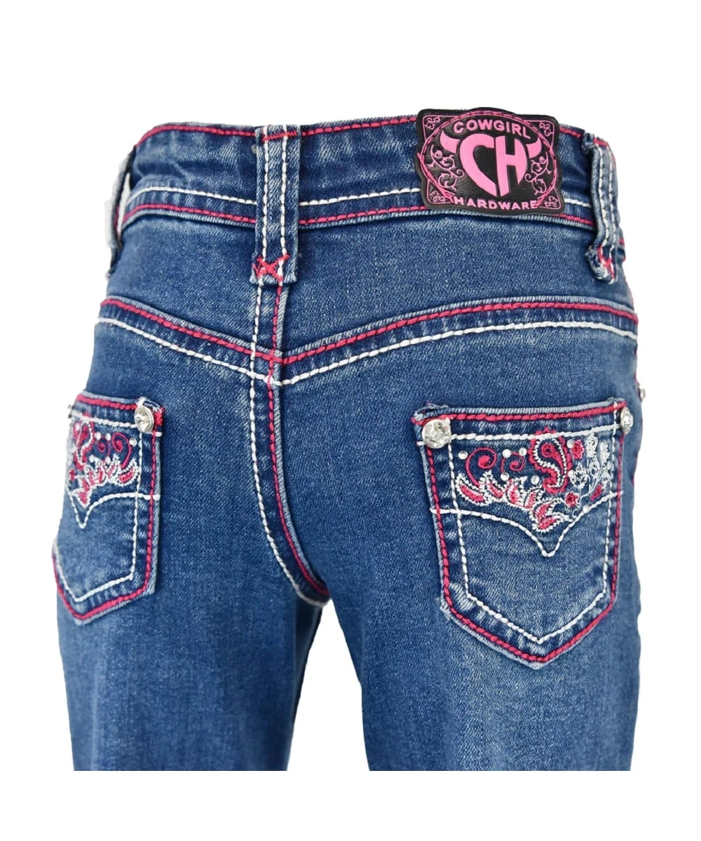 72% Cotton/26% Polyester; Medium Wash; Five Pocket Styling; Adjustable Waist Feature; Pizazzy Faux Flap Vine Paisley Design On Back Pockets; Accented With Silver Studs; Logo Patch; White And Hot Pink Contrast Stitching; Bootcut Jean; Style #802128-450-JT