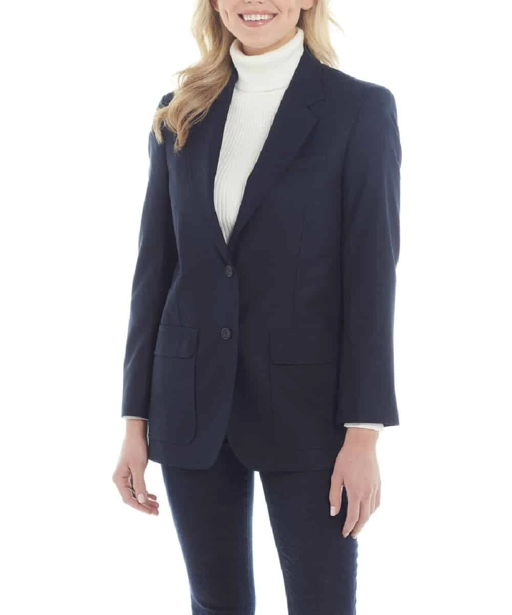 80% Polyester/ 20% Rayon; Navy Blazer; Padded Shoulders; 2 Front Buttons; 3 Side Buttons On Cuff; 1 Breast Pocket; 2 Flap Closure Pockets; Style #CL7287