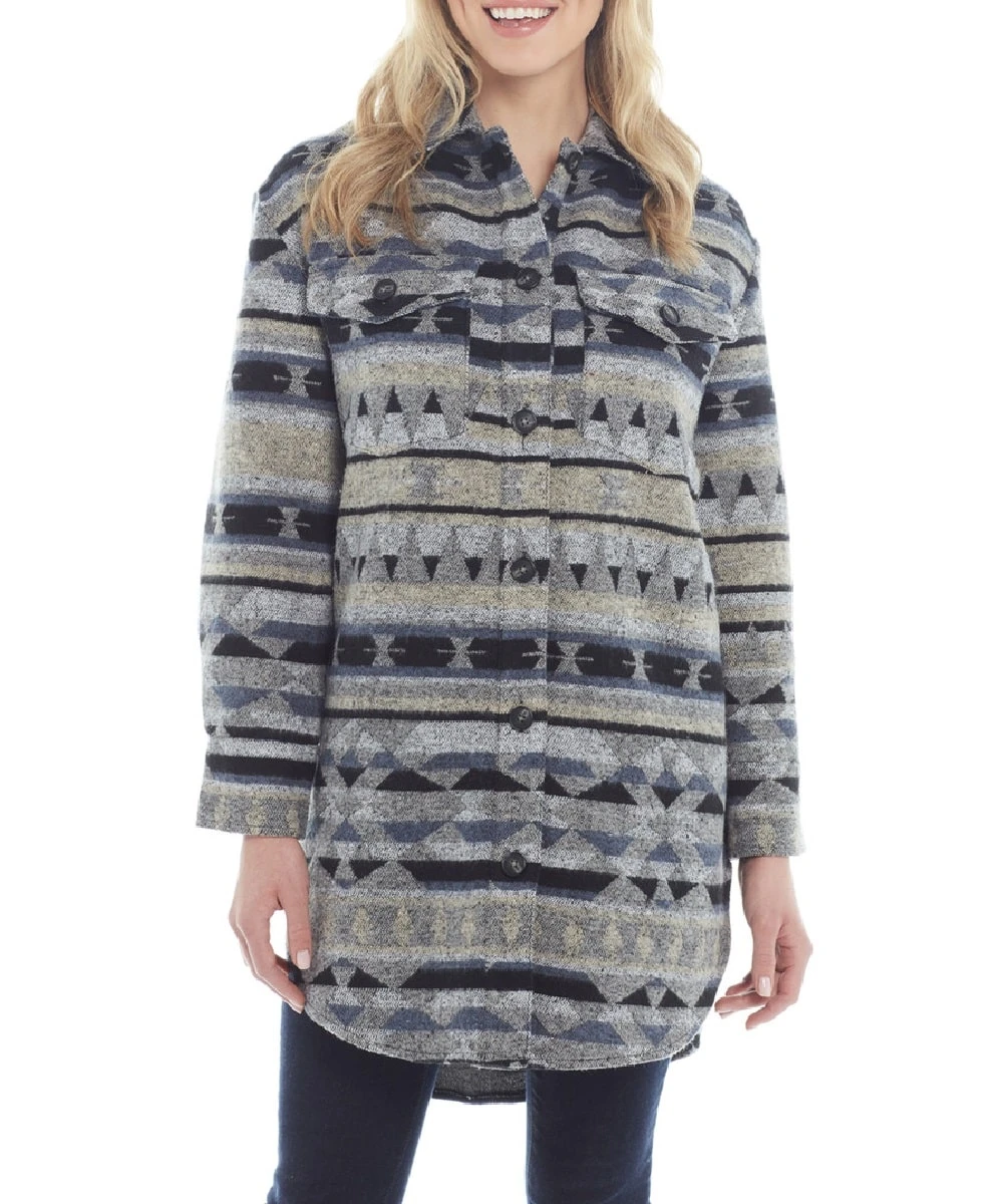 100% Polyester; Color: Slate Grey/Navajo Blanket; Shirt Jacket With Button Front Closure; Open Collar; Two Button Flap Pockets; Boyfriend Fit; Hi-Lo Hem; Style #CR16249