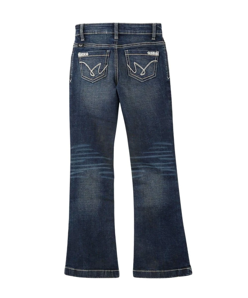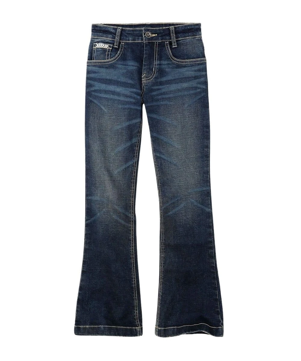 10 Oz. Stretch Denim; Slim Fit; Zip Fly With Button Closure; Five Pocket Styling; Fashion Stitch Design On Back Pockets; Tint; Hand Sanding; Whiskers; Chevrons; Knee Starburst; Boot Cut Jean; Color: Rinse; Style #CB23061005