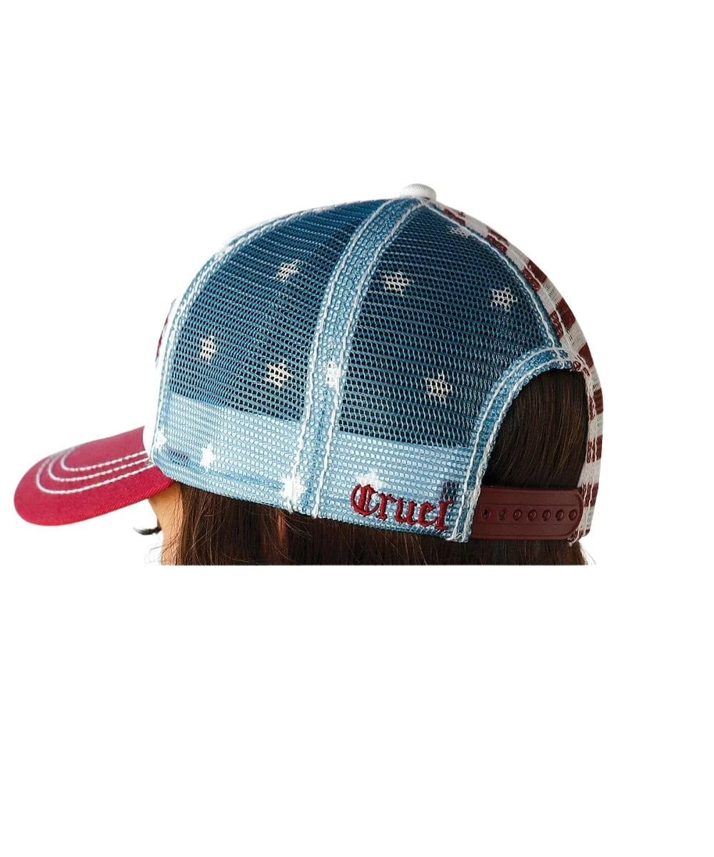 Front Panel Chenille Patch; Contrast Stitching; Stars And Stripes Printed Mesh Back; Snap Back Closure; One Size Fits Most; Color: Red/White; Style #CCC0041024