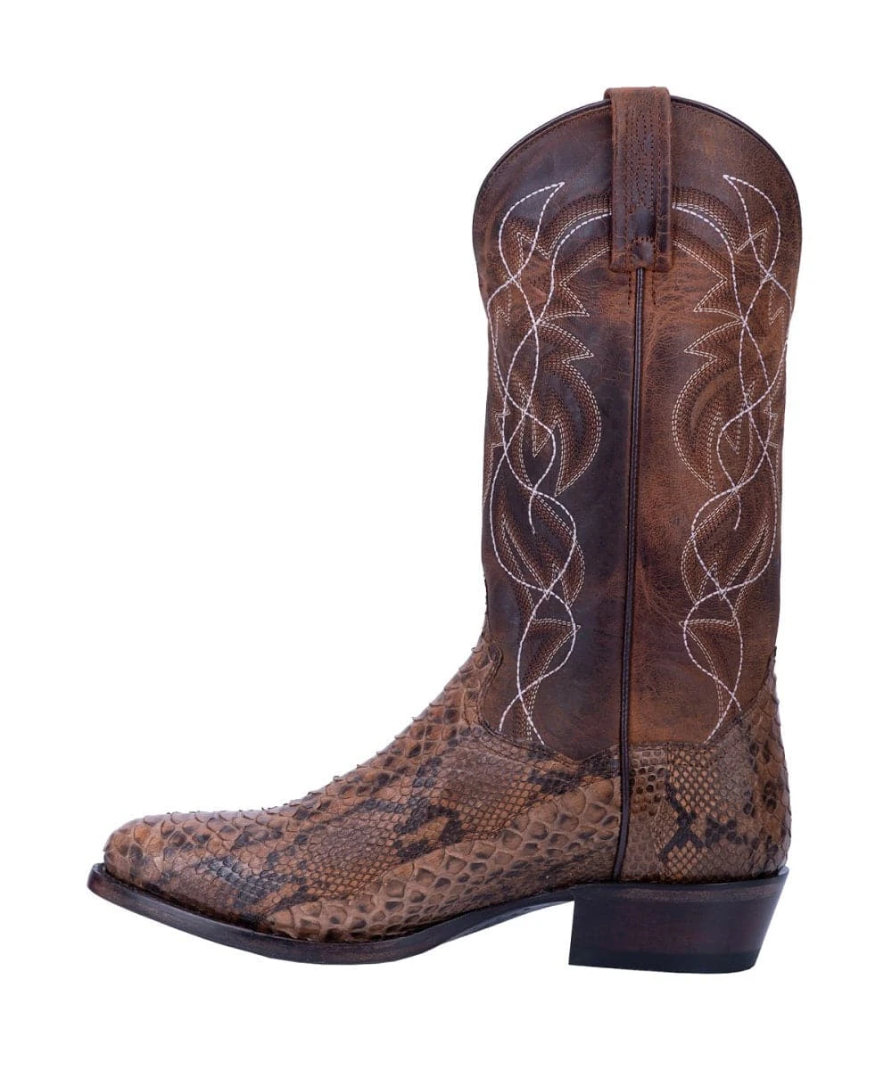 13″ Boot; Genuine Python Leather; Leather Lining; Multi Row Tonal And White Accent Stitching; Removable Antibacterial And Antifungal Soft Strike Orthotic; 1 3/8″ Cowboy Heel; Round Toe; Leather Outsole; Style #DP3037