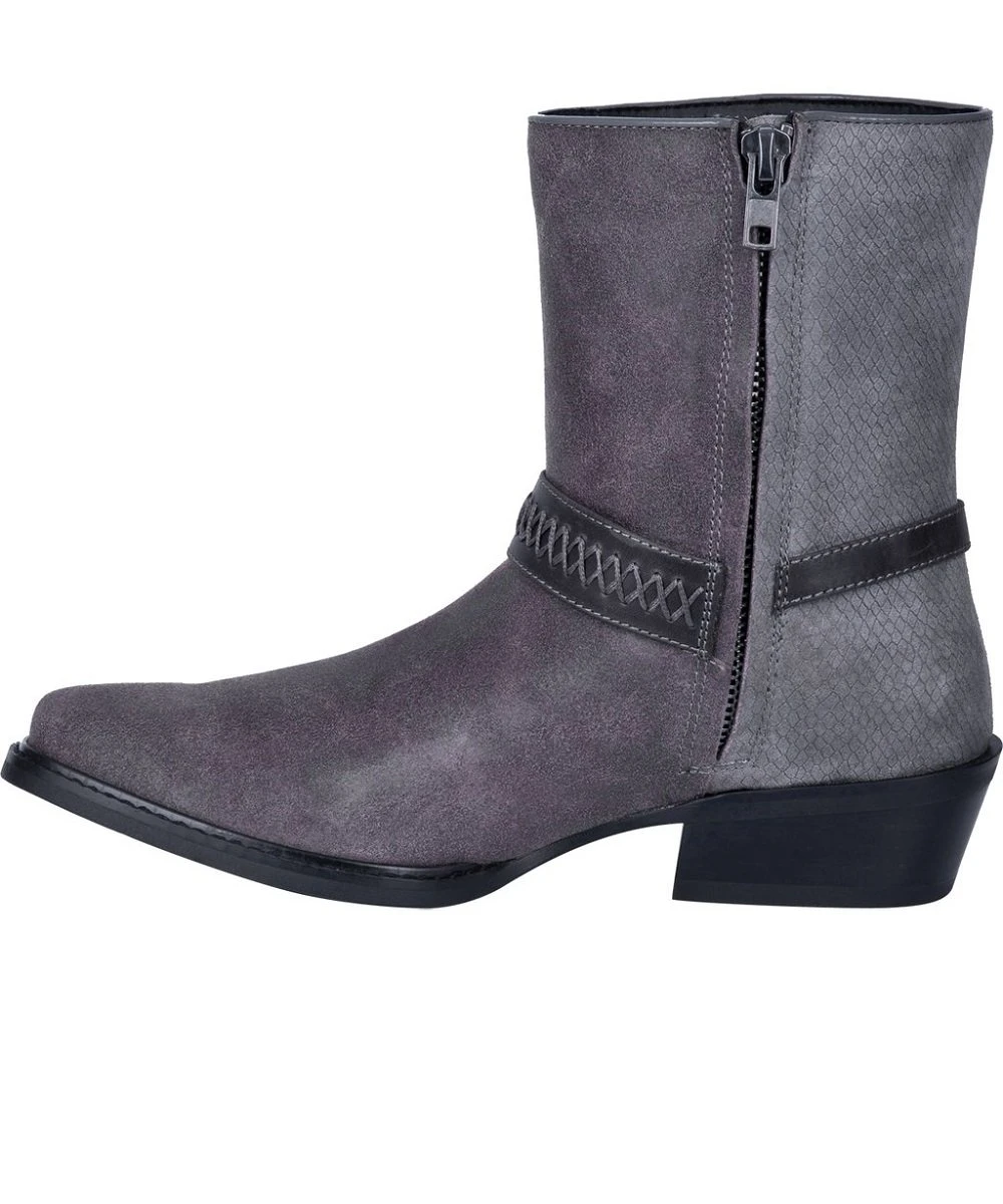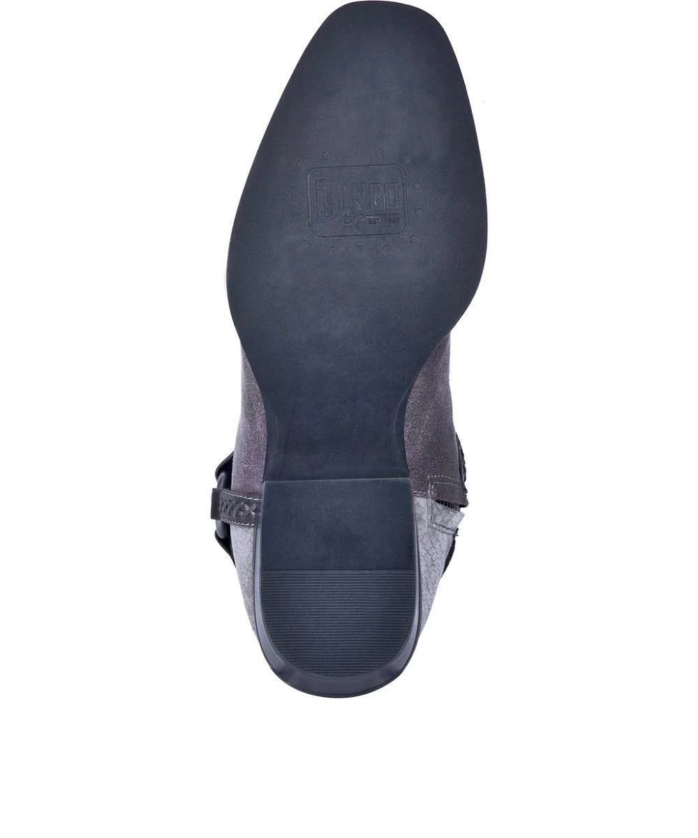 7 1/2″ Boot; Gray Leather With Black Harness; Hinged Cushion Insole; Side Zip For Easy On/Off; Unit Heel; Round Toe; Rubber Outsole; Style #DI 219 GREY