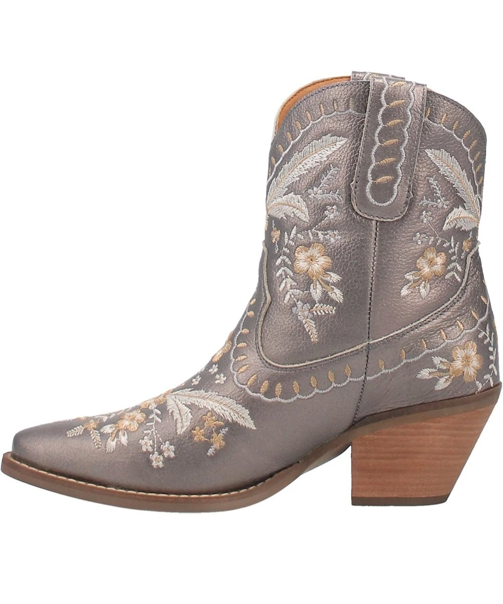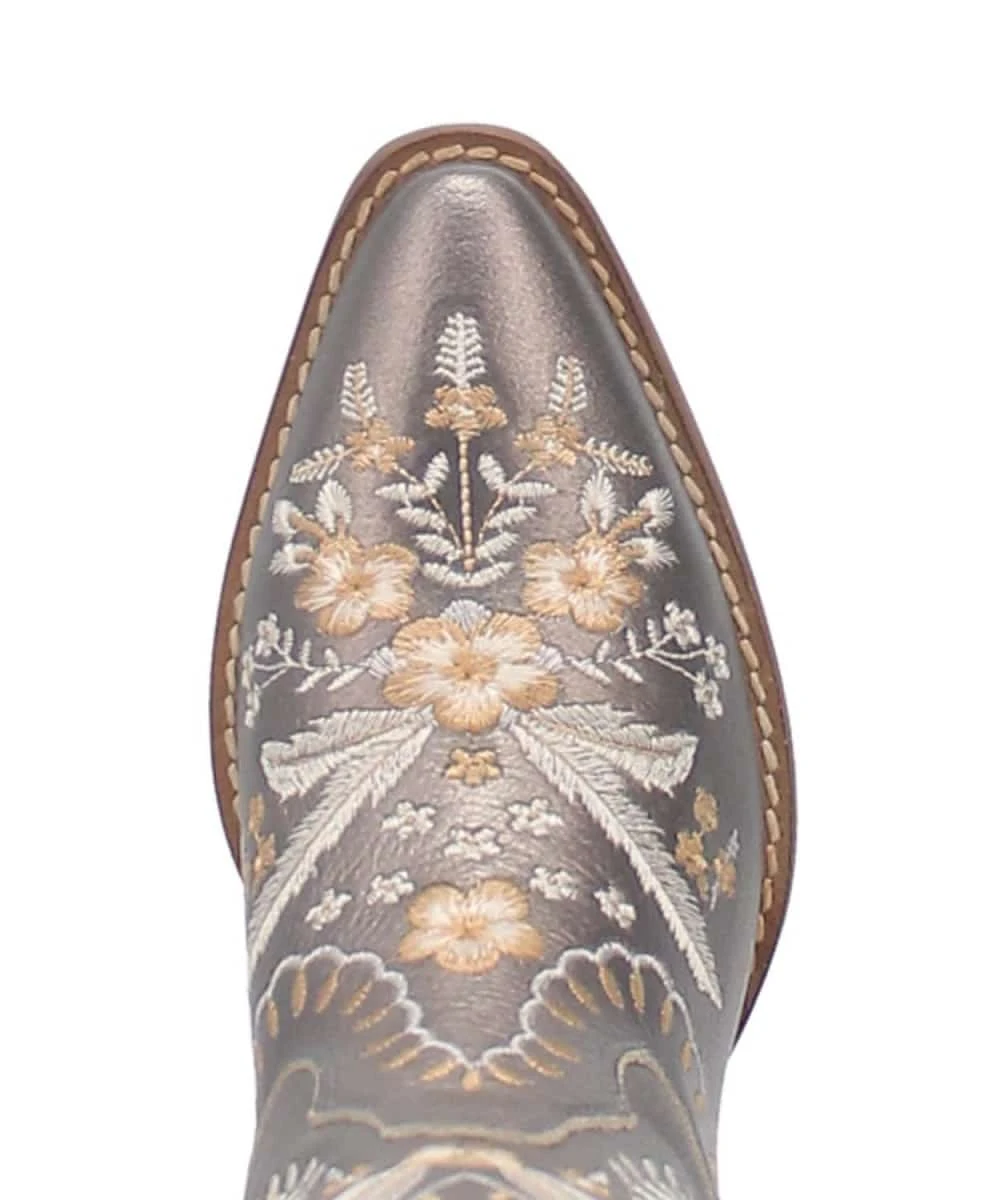 7″ Boot; Pewter Leather; Grey, White And Tan Floral Embroidery Design Accent; Hinged Cushion Insole; Cowboy Heel; Almond Toe; Garman Outsole; Style #DI748 PEWTER