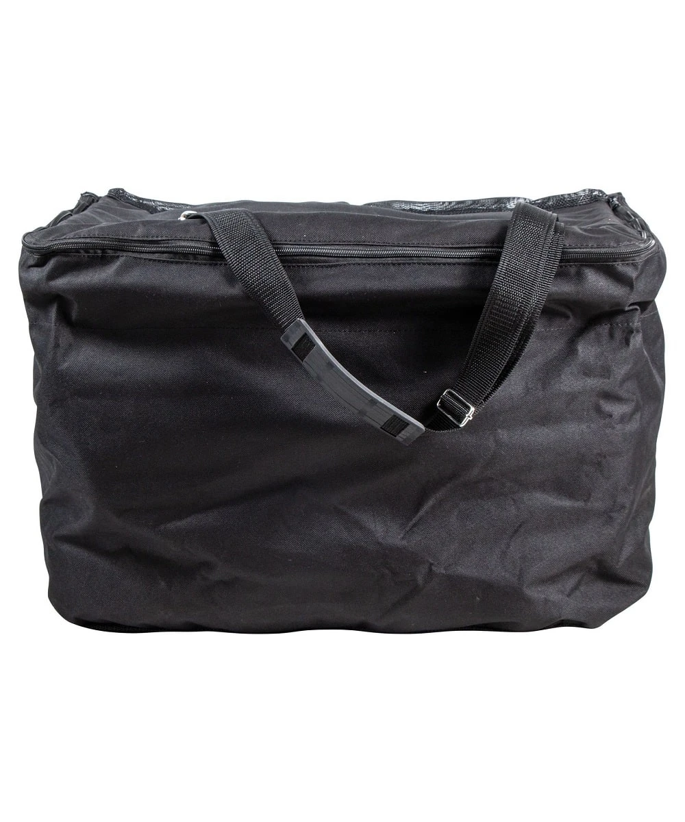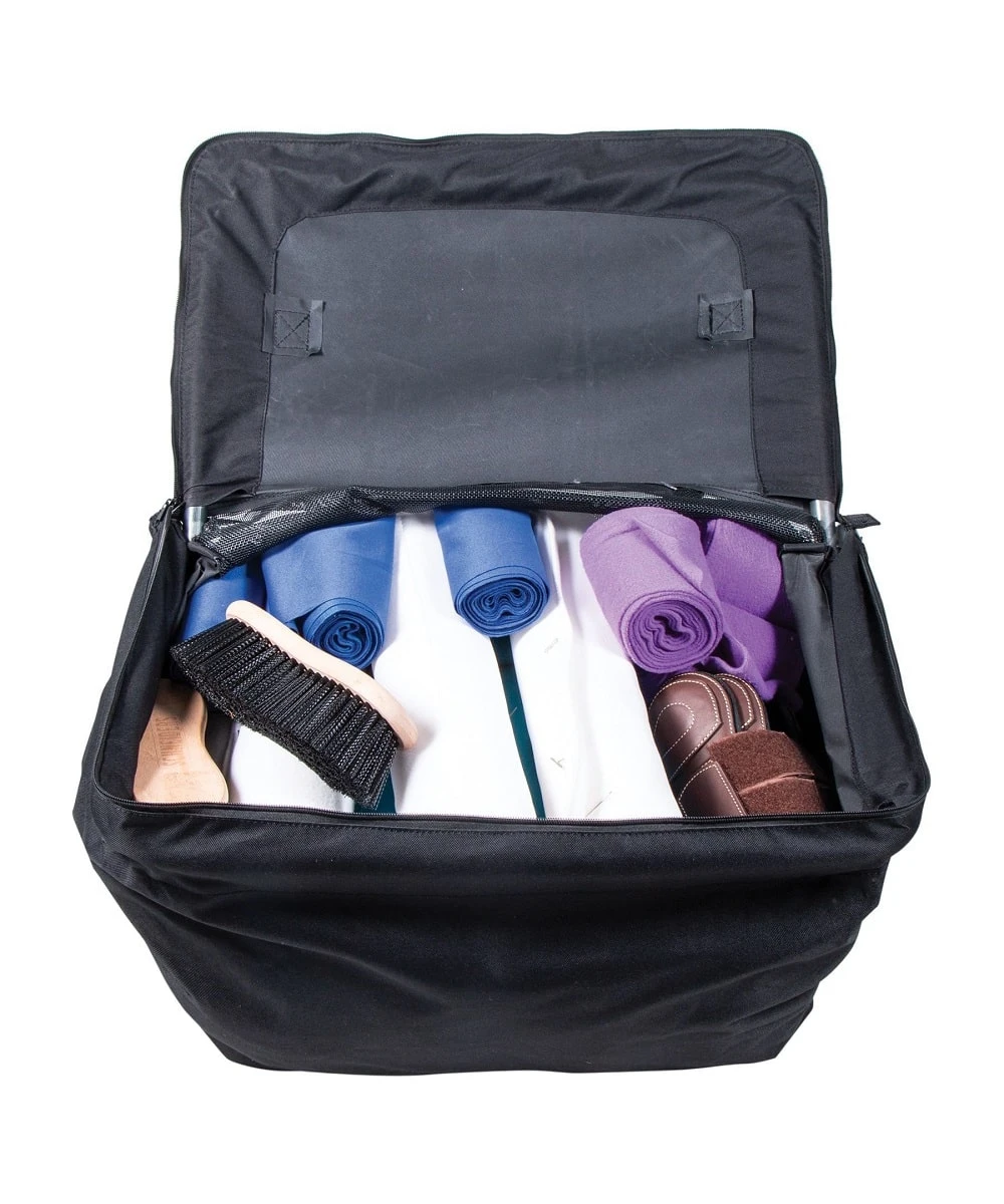 600D Poly Fabric; Mesh Backside And Bottom; Framed Top Lid With Zipper Closure; Easy Stay Open Round Metal Framed Lid With A Zipper Closure For Storage To Help Prevent Dust Buildup And Keep Items Organized; Can Be Used As An Open Top Hay Feeder And Fits 2 Flakes Of Hay; Used As A Sheet Or Boot Storage Bag On The Front Of Stall; Filled Measures: 15″ D x 16″ H x 23 1/2″ W; Convenient Removable Carrying Strap Can Double As A Hanging Strap On Stall Door; Includes Shoulder Protector For Carrying; Color: Black; Style #41346