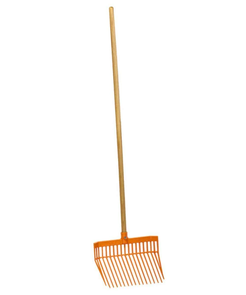 Extra Strength Polycarbonate; Uniquely Angled Tines Provide Easy Pickup With Less Spilling; Designed For Long Lasting Use, Strength, And Flexibility; 52″ Wood Handle; Fork Head Measures Approximately: 13 1/8″ L x 15 1/8″ W; Color: Orange; Style #12673-4
