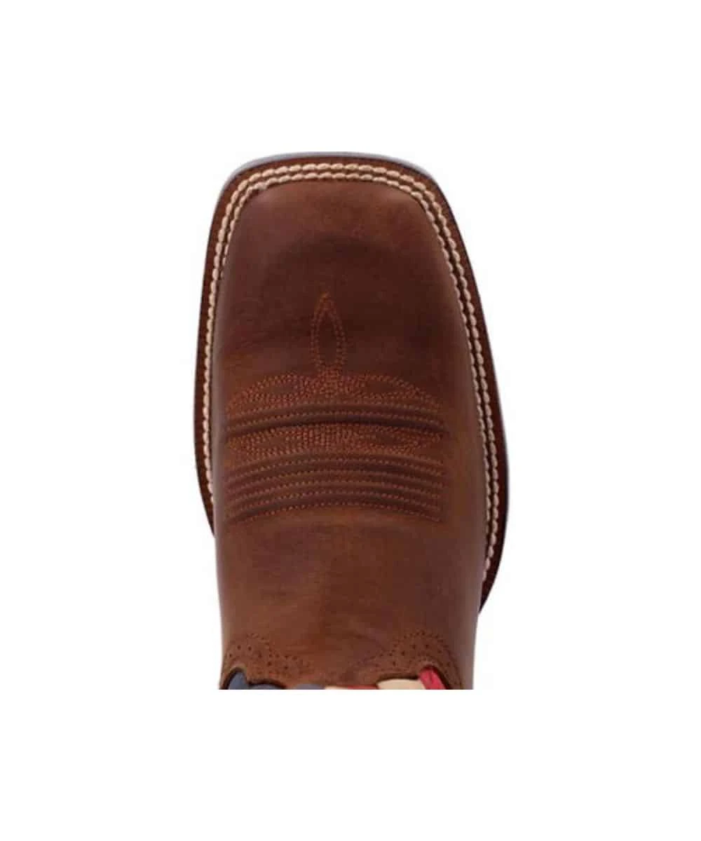 Full-Grain Leather Foot And Collar; Fiberglass Shank; Color: Brown With Union Flag; 11″ Upper; Calf Circumference: 15″; Littleway Stitch Forepart And Shank Area For Ultimate Durability; Square Toe; Heel: 1-1/2″ Stockman; Leather Wrapped Heel; Rubber Outsole With Two-Tone Detailing; Double Row Sole Stitch; Durango Advanced Comfort System With Removable Footbed That Contains Anti-Microbial Mesh To Prevent Odor Causing Bacteria, Shock Pads To Alleviate Pressure, And Airflow Channels;