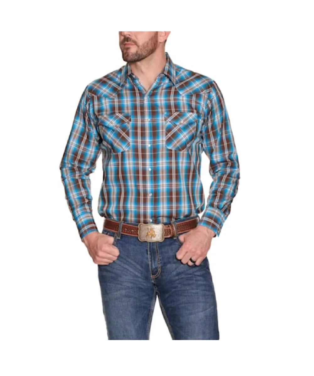 65% Polyester/35% Cotton; Long Sleeve; Spread Collar; Pearl Snap Closure; Two Single Point Front Yokes; Two Snap Flap Chest Pockets With Single Point Yokes; One Single Point Yoke On Back; Color: Bright Turquoise And Chocolate Brown Textured Plaid; Style #152029209-BN