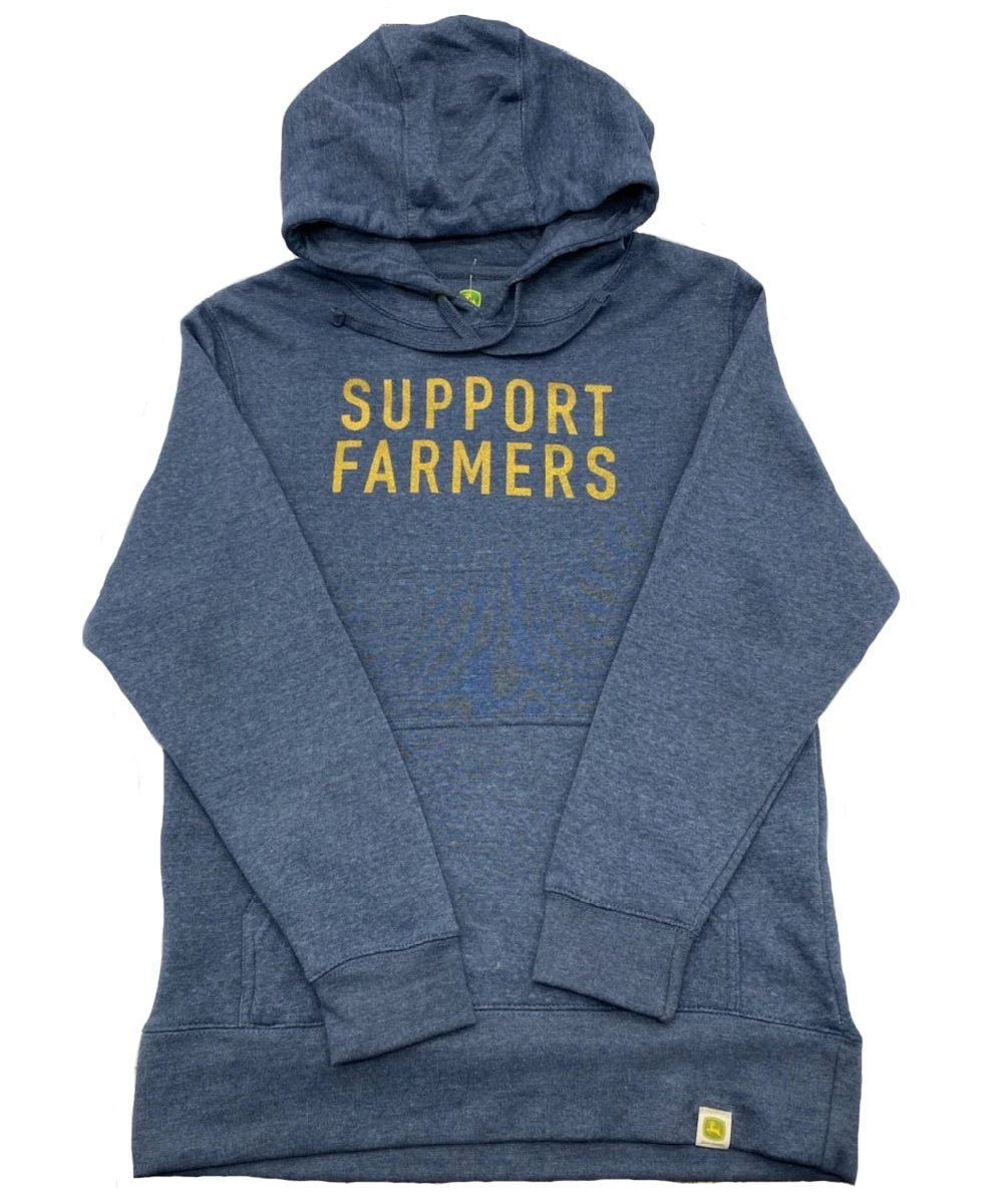 60% Cotton/40% Polyester; Long Sleeve; Hooded Collar With Adjustable Draw Cords; Front Kangaroo Pocket; Gold Support Farmers Print With Glitter Detail; Color: Navy Heather; Your Purchase Today Means That John Deere Will Make A $1 Donation To Feeding America That Will Help To Provide At Least 10 Meals To Local Food Banks; Style #D23025732