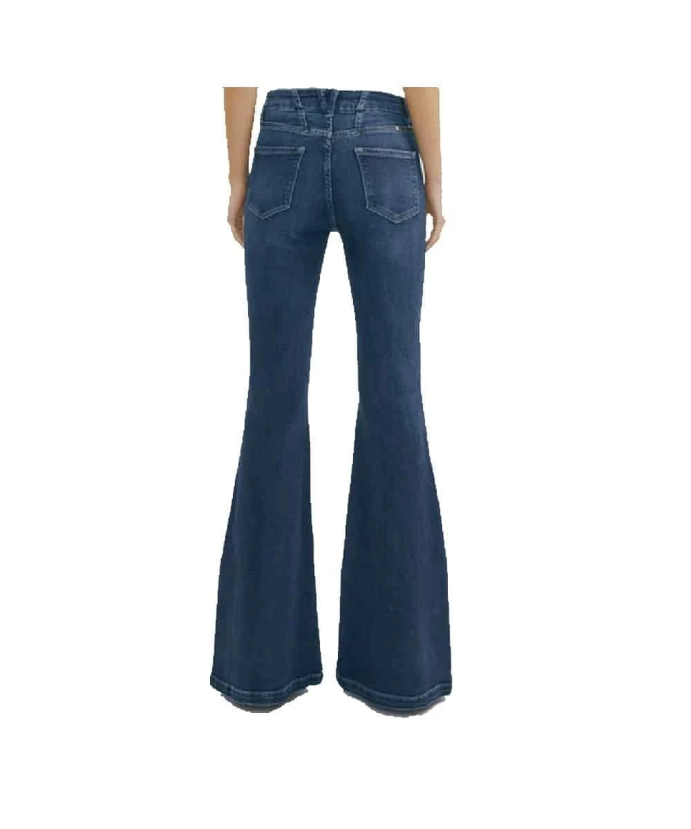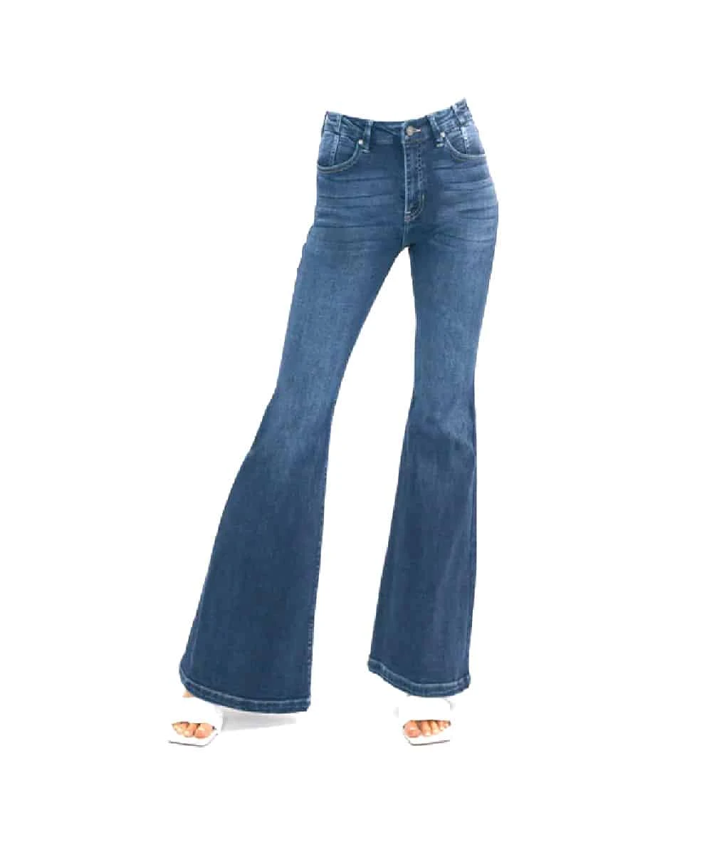 93% Cotton/5% T-400/2% Spandex;Â High Rise; Stretch; Button Closure; Zip Fly; Medium Fading; Whiskering; Darts Above Back And Front Pockets; Four Pocket Style; Super Flare Leg; Style #KC9306AD