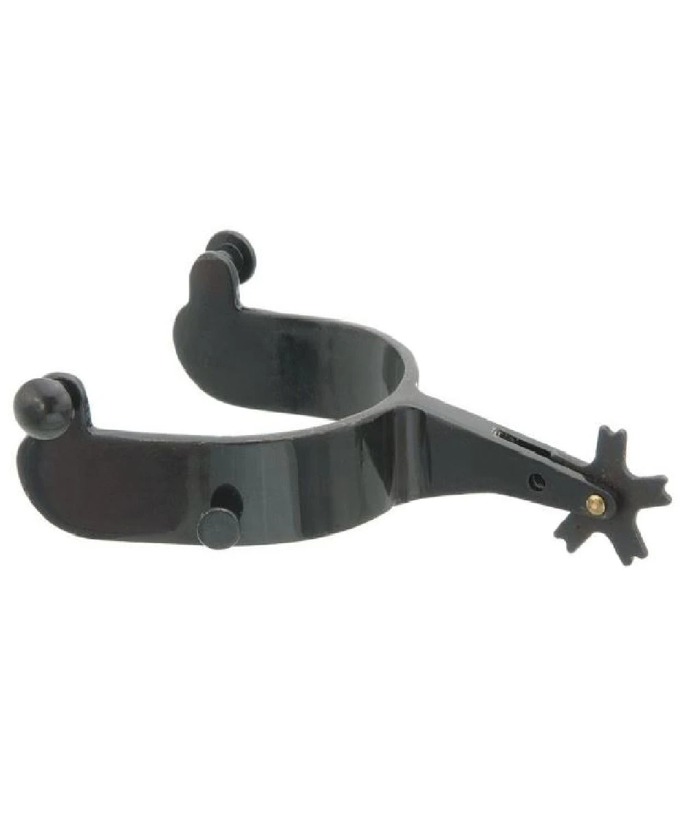 Gun Metal Blue Finish; Steel; Solid Buttons; 1″ Band; 15 Degree Offset; 2 1/4″ Shank; Bull/Bareback Combination Spurs; Style #78-8022