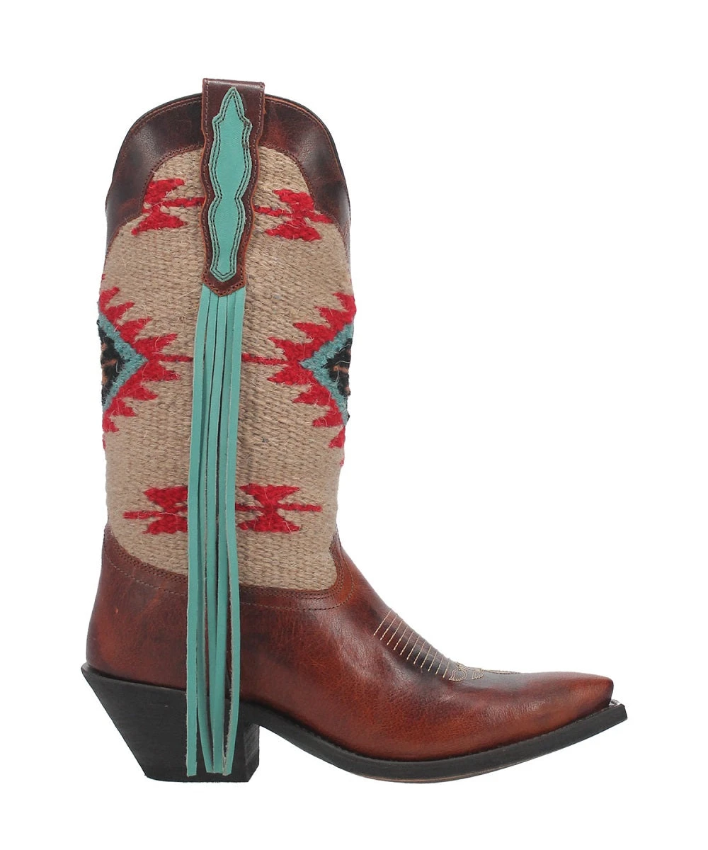 11″ Boot; Leather Foot; Southwestern Saddle Blanket Print Shaft; Cushion Comfort Insole; Leather Pull Fringe Accent; Snip Toe; Medium Cowboy Heel; Laredo Flex Outsole; Style #52375