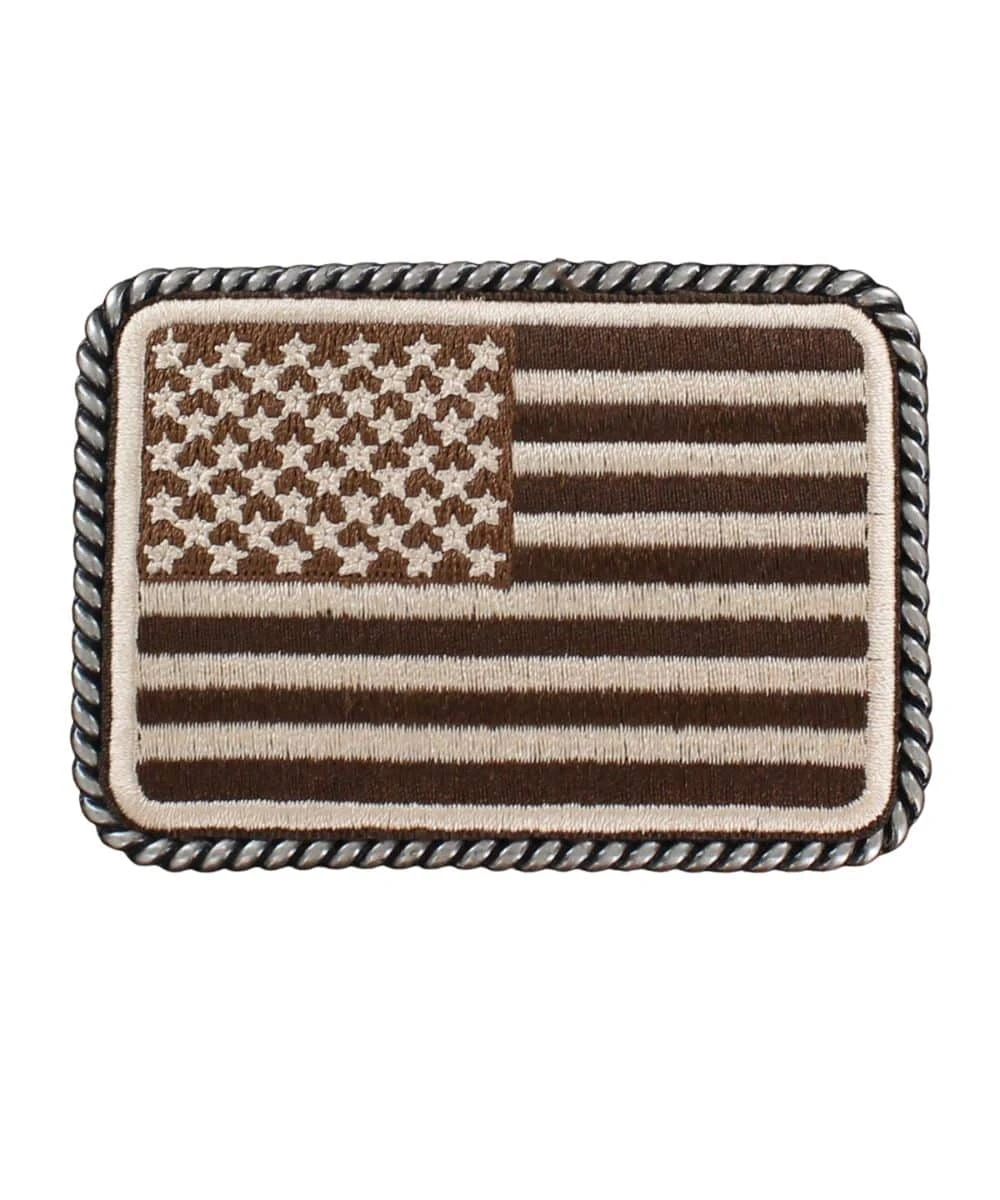 Rectangular Buckle; Rope Edge; Brown, Tan, And Ivory USA Embroidered Flag Patch Center; Measures Approximately: 3 3/8″ x 2 1/4″; Style #A37010