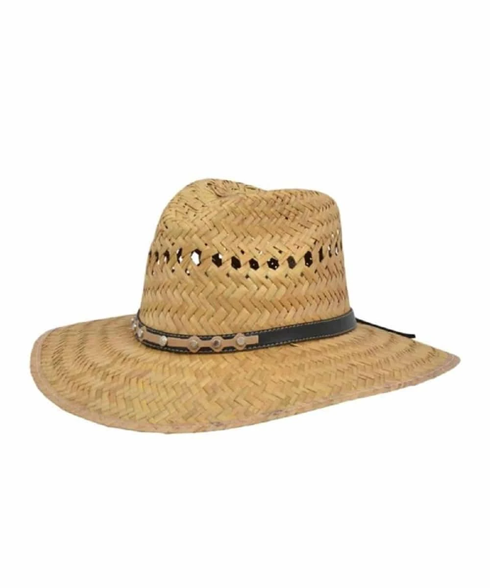 10X; Eastland palm; 4″ Brim; Hondo Crown; Elastic Sweat Band; Brown And Tan Overlay Hat Band With Concho And Stud Accent; Style #D05500