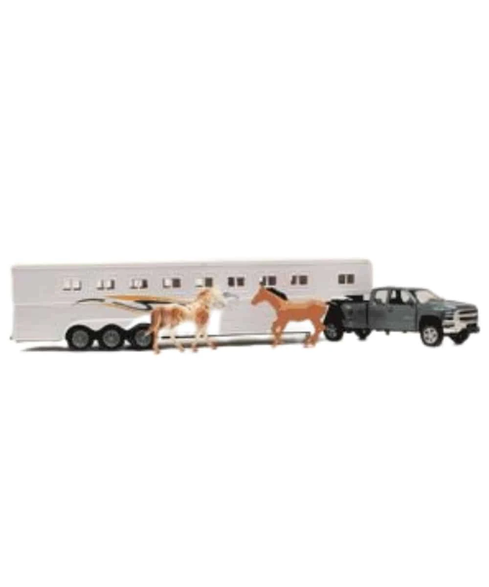 Plastic; Contains: 2 Horses, 1 2500HD Chevy Silverado, 1 15″ Trailer; Doors Can Be Opened; 1:32 Scale Die Cast With Plastic; Not Suitable For Children Under 3; Style #50632