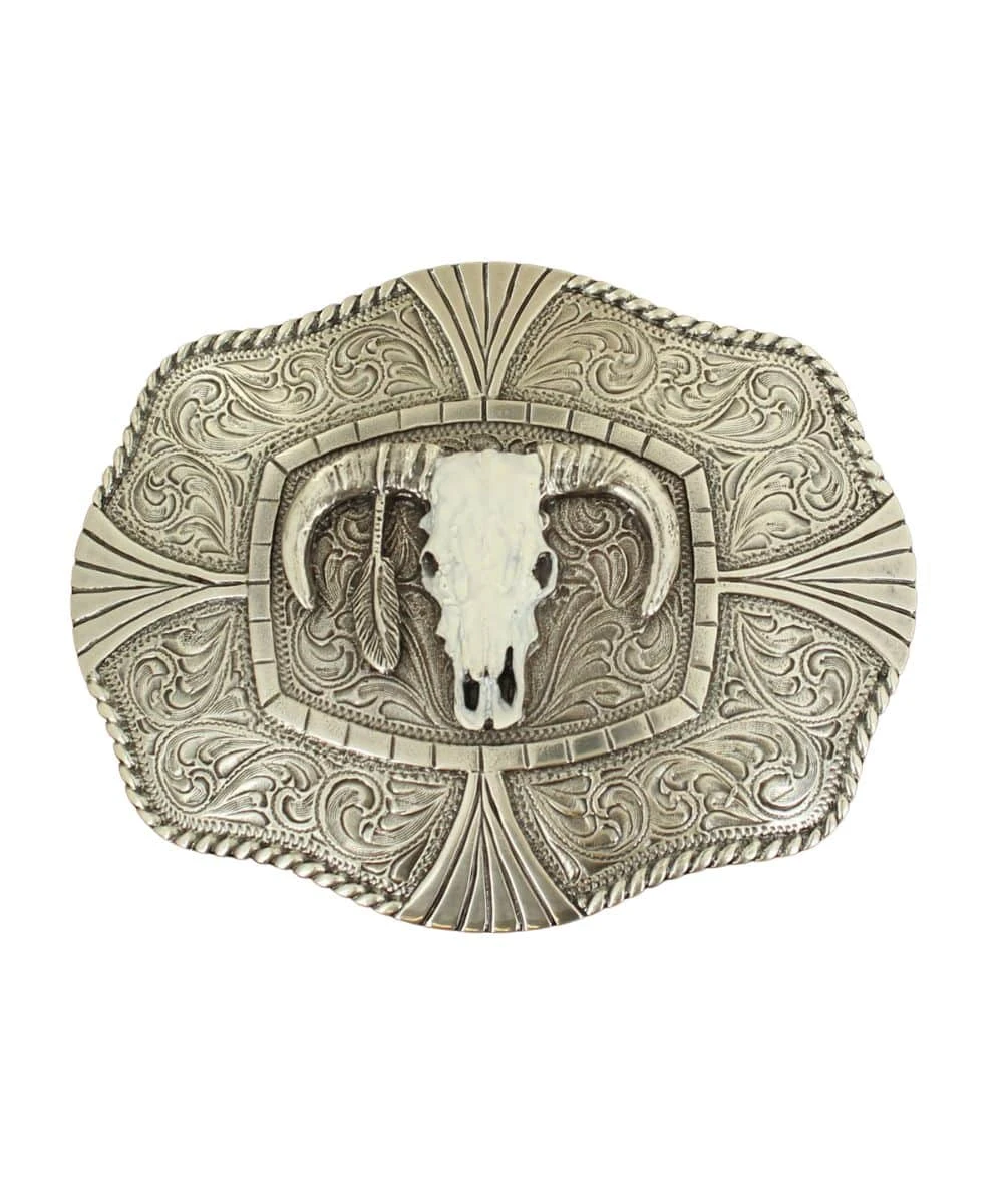 Antique Silver; White Painted Steer Skull Design; Western Scroll Background; Rope Edge; Rectangle Shape; Measures Approximately: 3-1/2″ x 4-1/2″; Style #37403