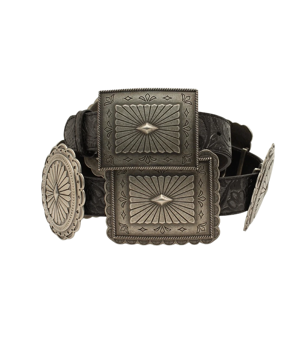Antique Silver Oval And Rectangle Conchos; 1-1/2″ Embossed Black Strap; Style #A1531801