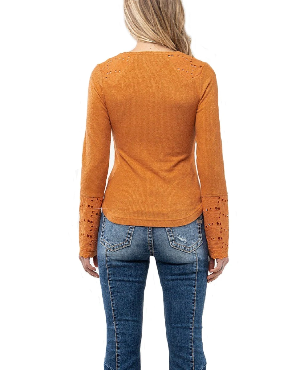 % Cotton/30% Rayon/75% Spandex; Long Sleeve; Ribbed Knit Construction; Five Button Placket; Eyelet Lace Accents; Shirt Tail Hemline; Color: Rust; Style #MT2278L
