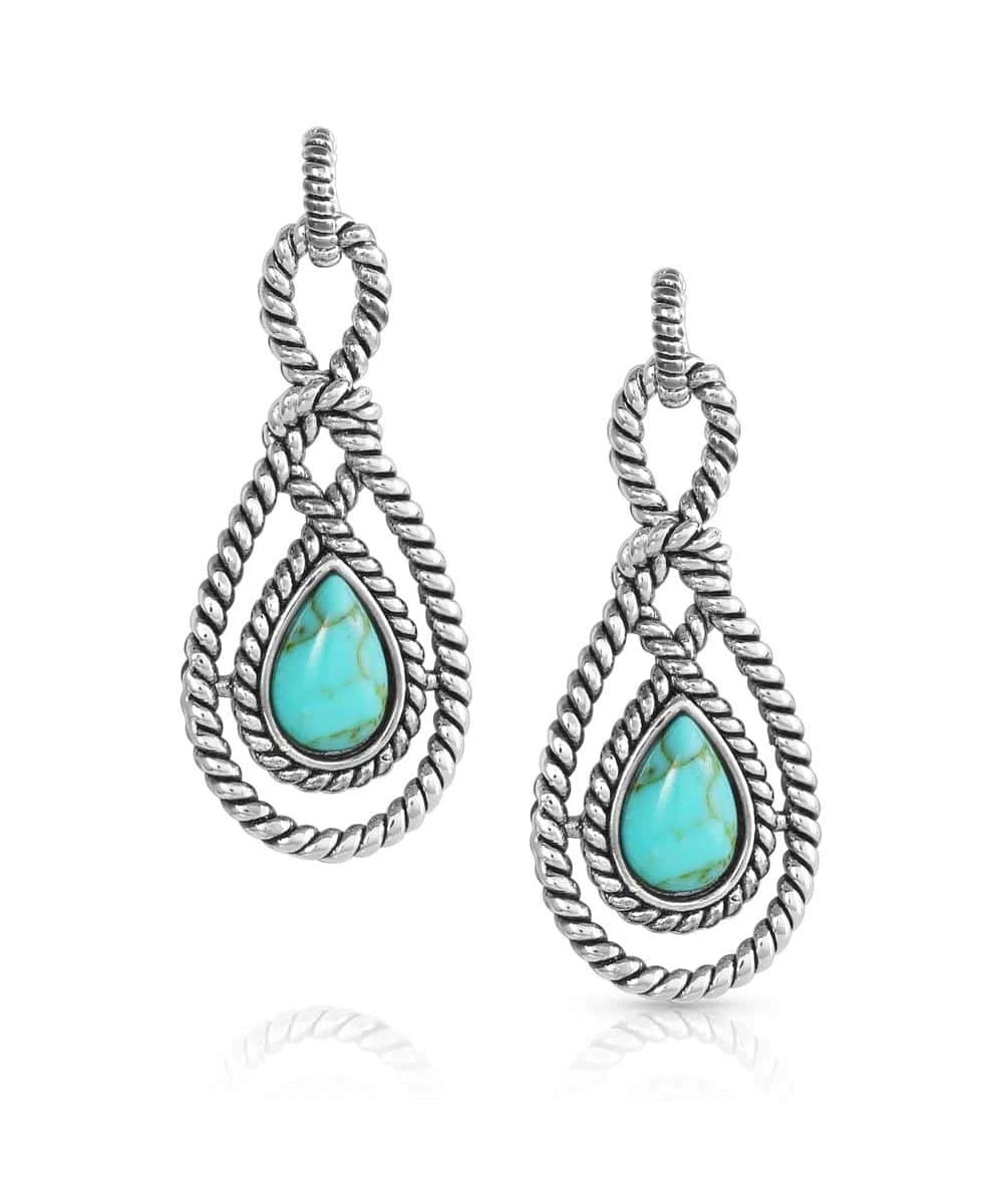 Silver Over Brass; Simple Rope Knot Design; Synthetic Turquoise Oval Stone Centerpiece; Wrapping Around To Create Open Design Is Silver Tone Twisted Rope; Hypoallergenic Stainless Steel French Wire; Style #ER5468