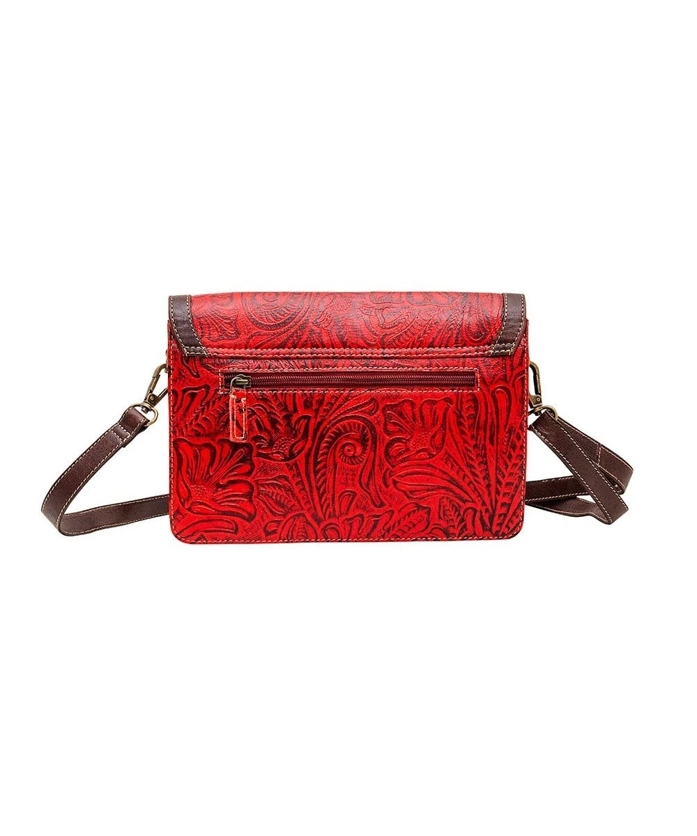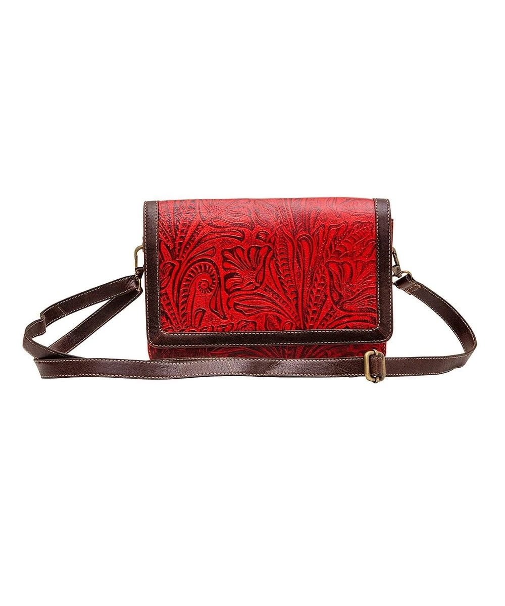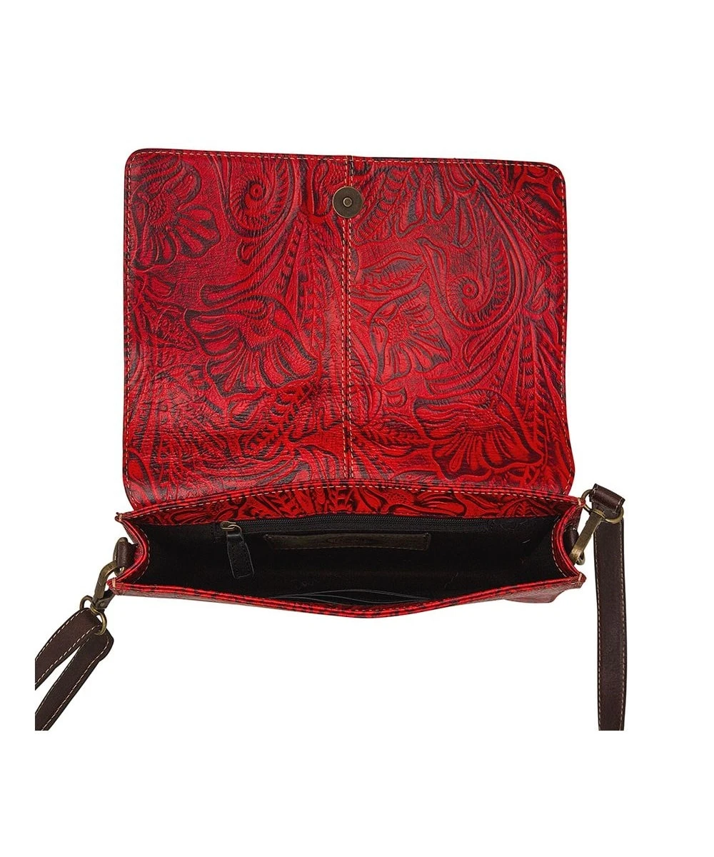 Muon Leather; Embossed Leather Design; Maroon Color; Magnetic Flap Closure; Zip Pocket On Back; 1 Interior Zip Pocket; 22″ Shoulder Strap; Measures Approximately: 10.25″W x 2″D x 6.5″H; Style #S-6560