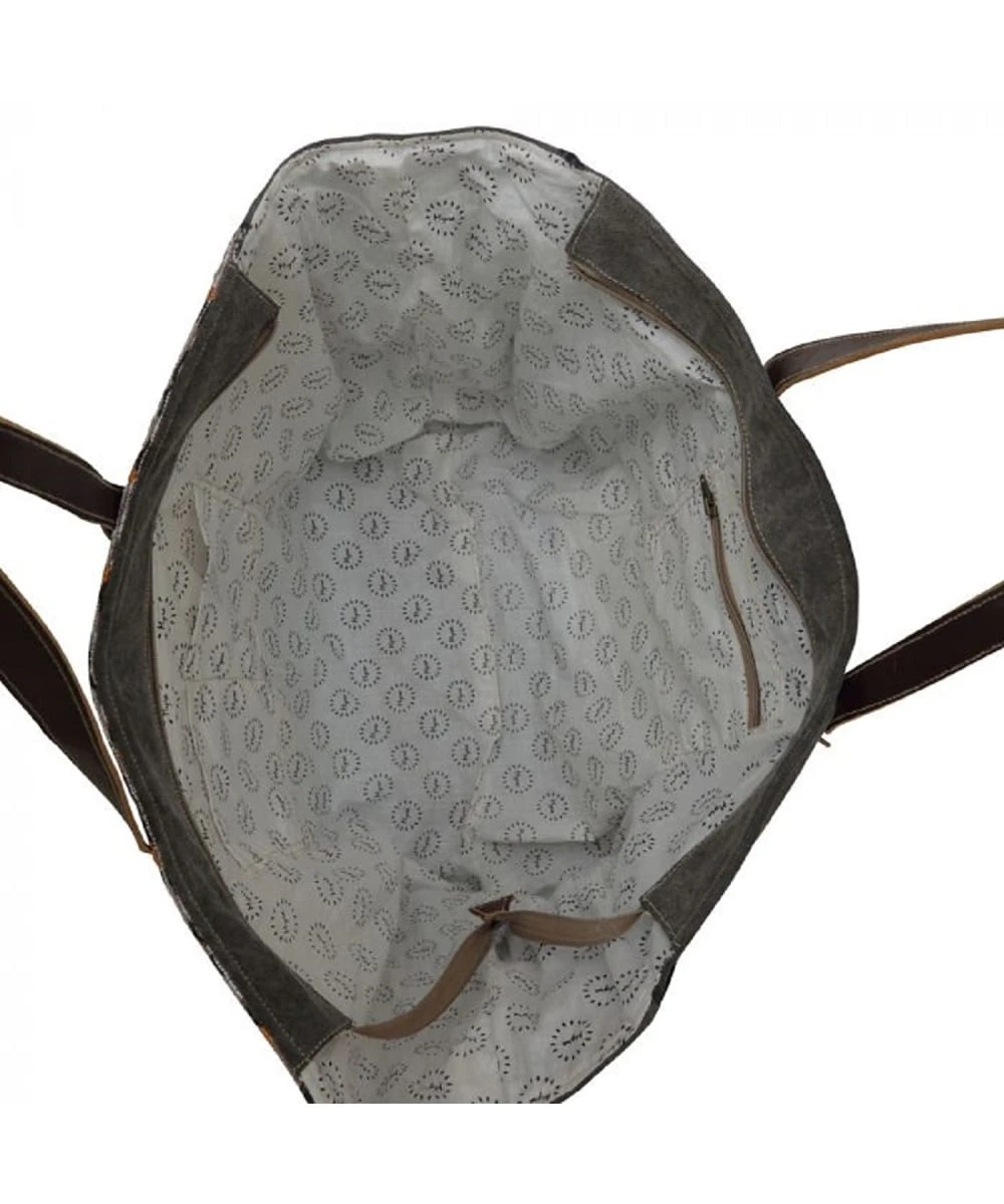 Canvas And Hairon Leather; Brown Leather Shoulder Straps/Handles; 12″ Handles; One Open Exterior Side Pocket; One Exterior Back Zipper Pocket; Large Zipper Closure; Small Zipper Interior Pocket; Two Small Open Interior Pockets; Measures Approximately: 20″ W x 8.5″ D x 16″ H; Indo-Western Detailed Patterns; Style #S-5666