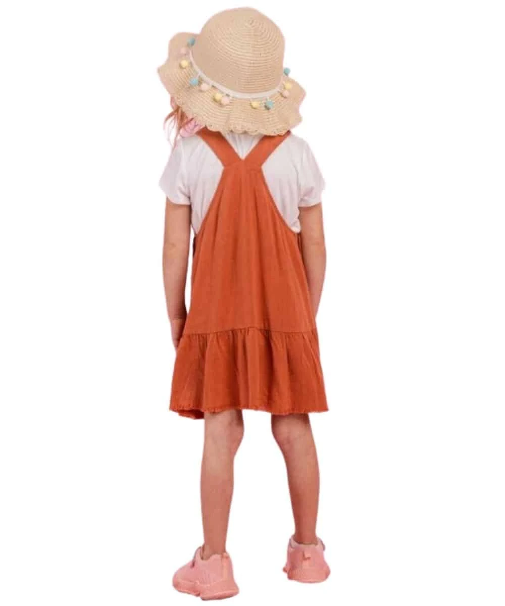 93% Rayon/ 7% Polyester; Color: Rust; Overall Style Shoulder Straps With Button Details; Front, Center Pouch; Ruffled Skirt; Raw Edge Hem; Style #ID14813K
