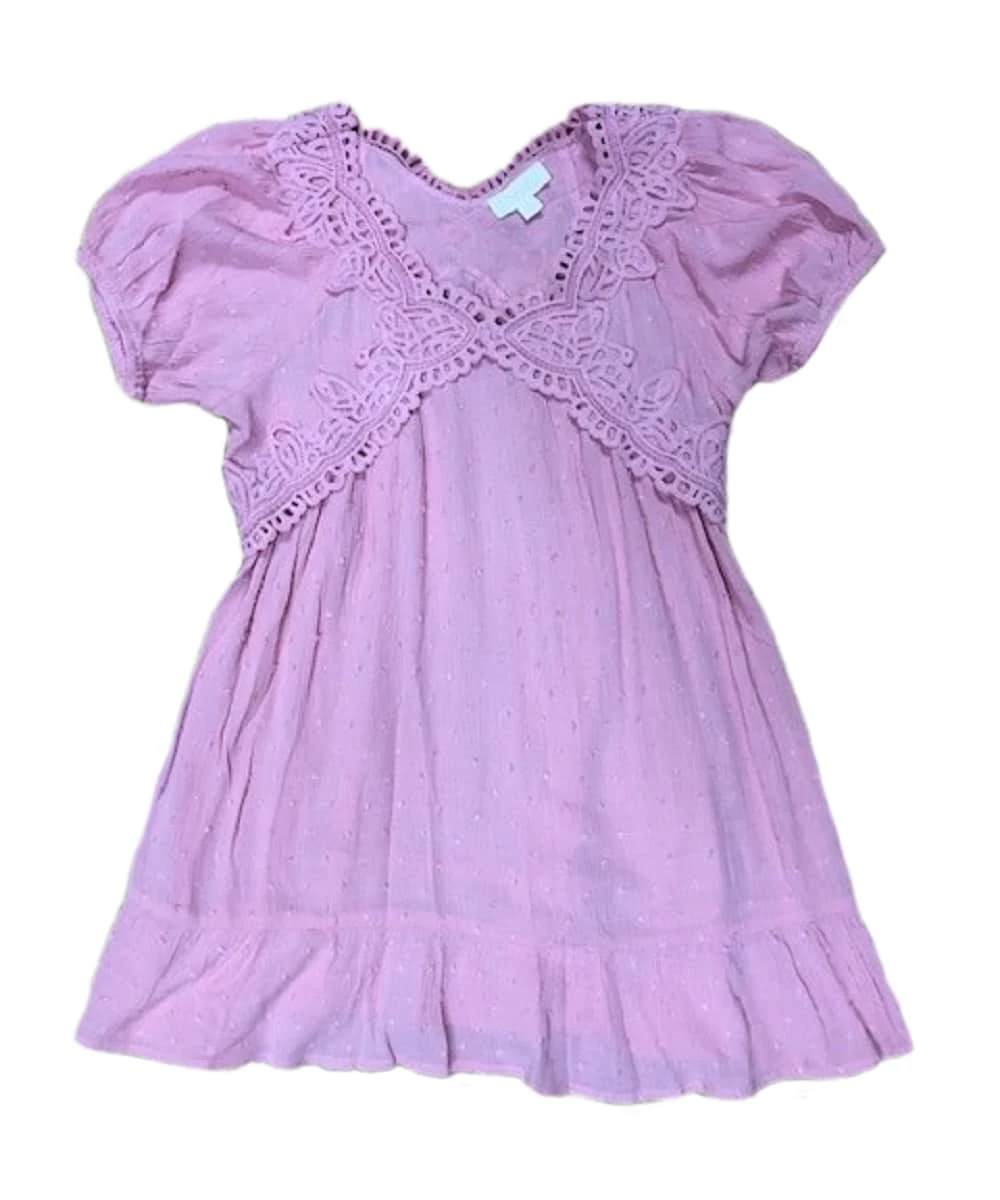 100% Rayon; Color: Strawberry Pink; Swiss Dot Fabric; Scoop Neck; Eyelet Lace Detail Across Front And Back; Elastic Gathered Short Sleeves; Hand Pockets; Ruffled Hem; Lightweight; Flowy Fit Dress; Style #ID13895K