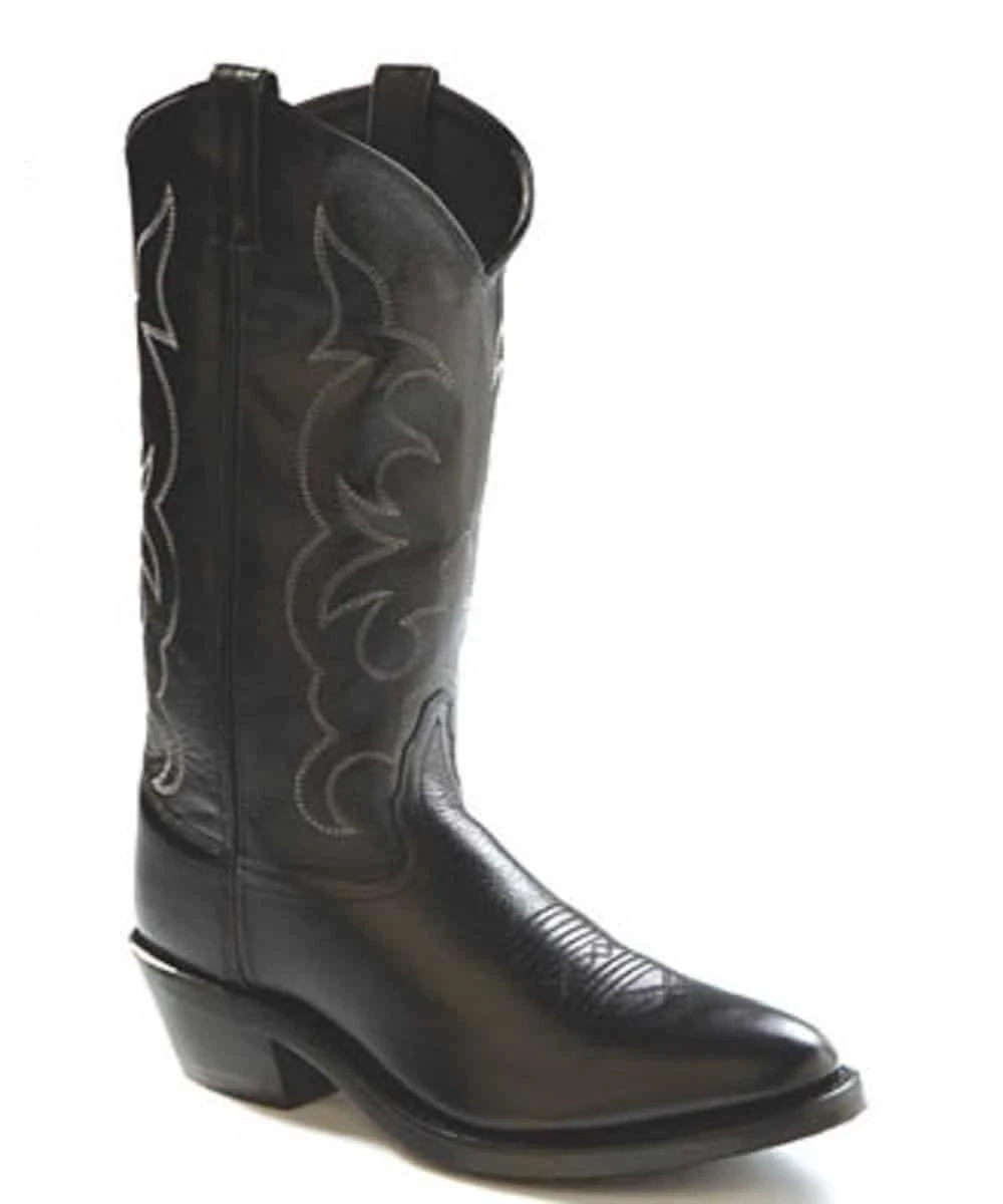 13″ Shaft; Black Leather; Man Made Lining; Reinforced Shanks; Three Row Fancy Stitching; Hand Corded Medallion; Cushioned Insole; Cowboy Heel; Narrow Round Toe; Tough Work Outsole; Style #TBM3010