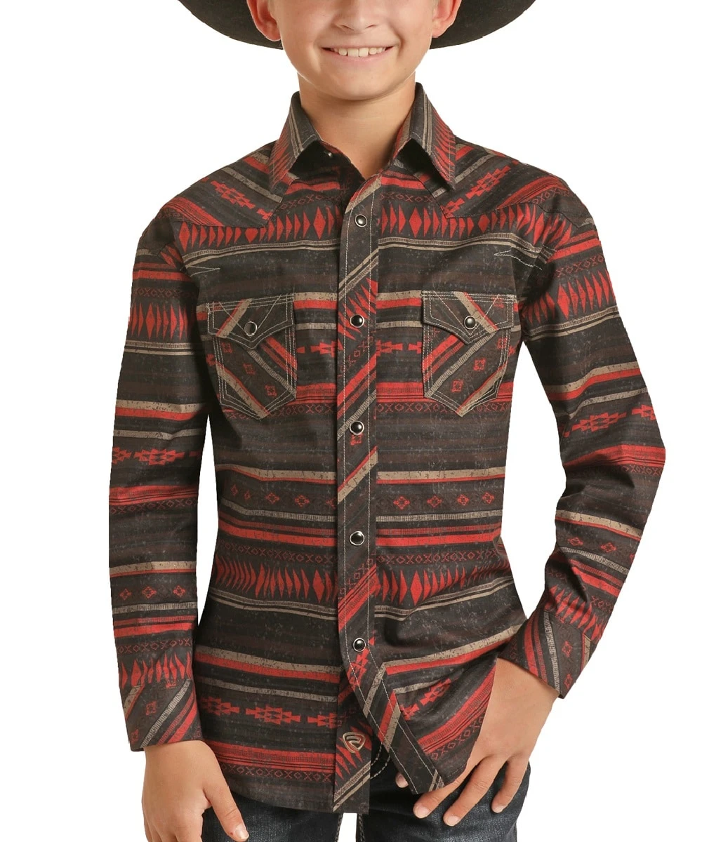 100% Cotton; Long Sleeve; Spread Collar; Black Snap Closures; Snap Front And Cuffs; Single Point Front Yoke Detail; Snap Flap Chest Pockets; Inside Placket Logo Embroidery; Black, Red And Burgundy Aztec Stripe Poplin Print; Style #RRBSOSRZ1J
