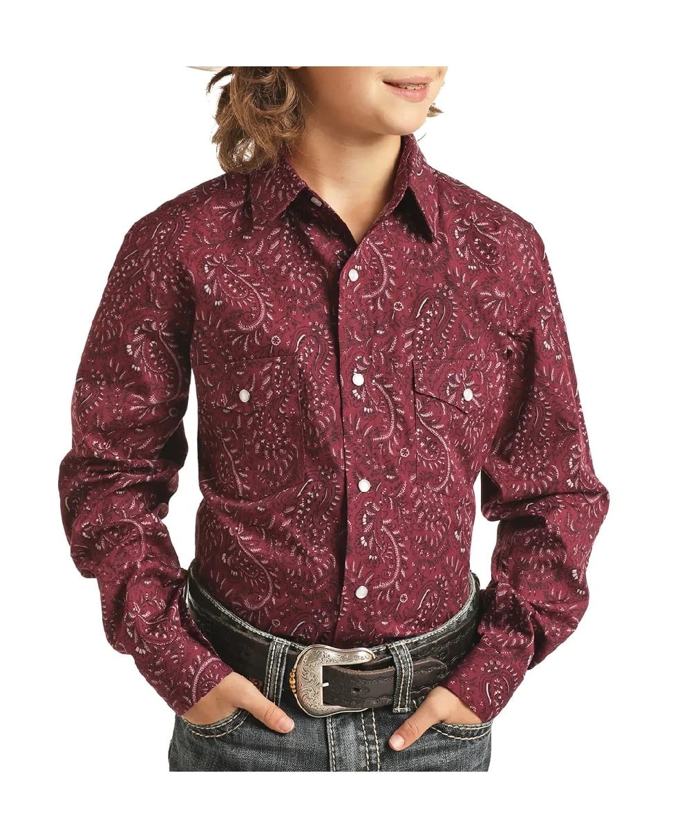 100% Cotton; Long Sleeve; Spread Collar; Pearl Snap Placket; Two Western Snap Flap Chest Pockets; One Snap Adjustable Cuffs; Western Back Yoke; Feathered Paisley Print; Color: Burgundy; Style #R2S3260