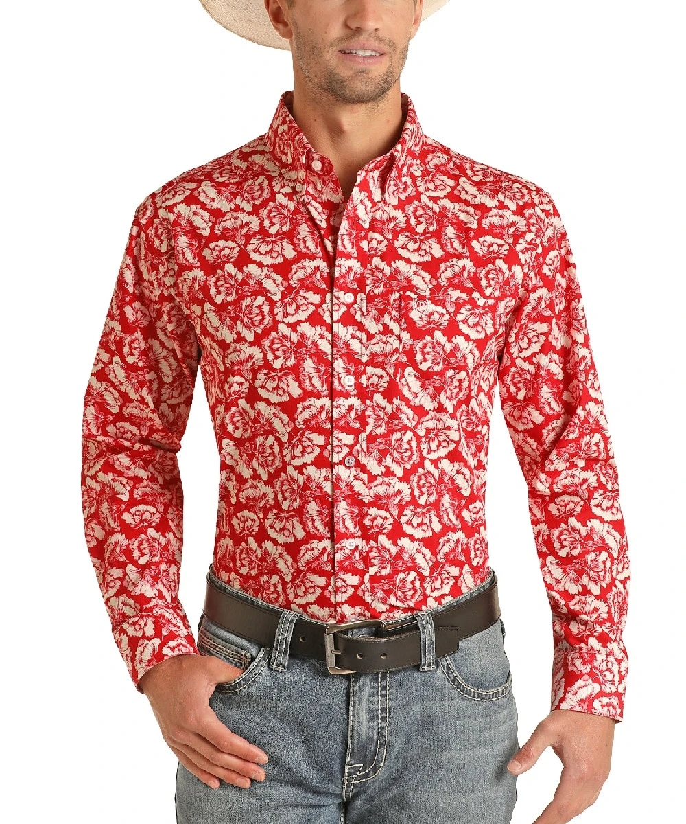 100% Cotton; Button Down Collar; Button Cuffs; Single Open Pocket With Panhandle Embroidery; Red Floral Print Design; Style #36D3176