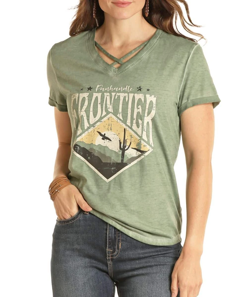Short Sleeve; V-Neckline With Criss Crossed Strap; Desert Frontier Graphic Print; Color: Sage; Style #WLWT21R0T9