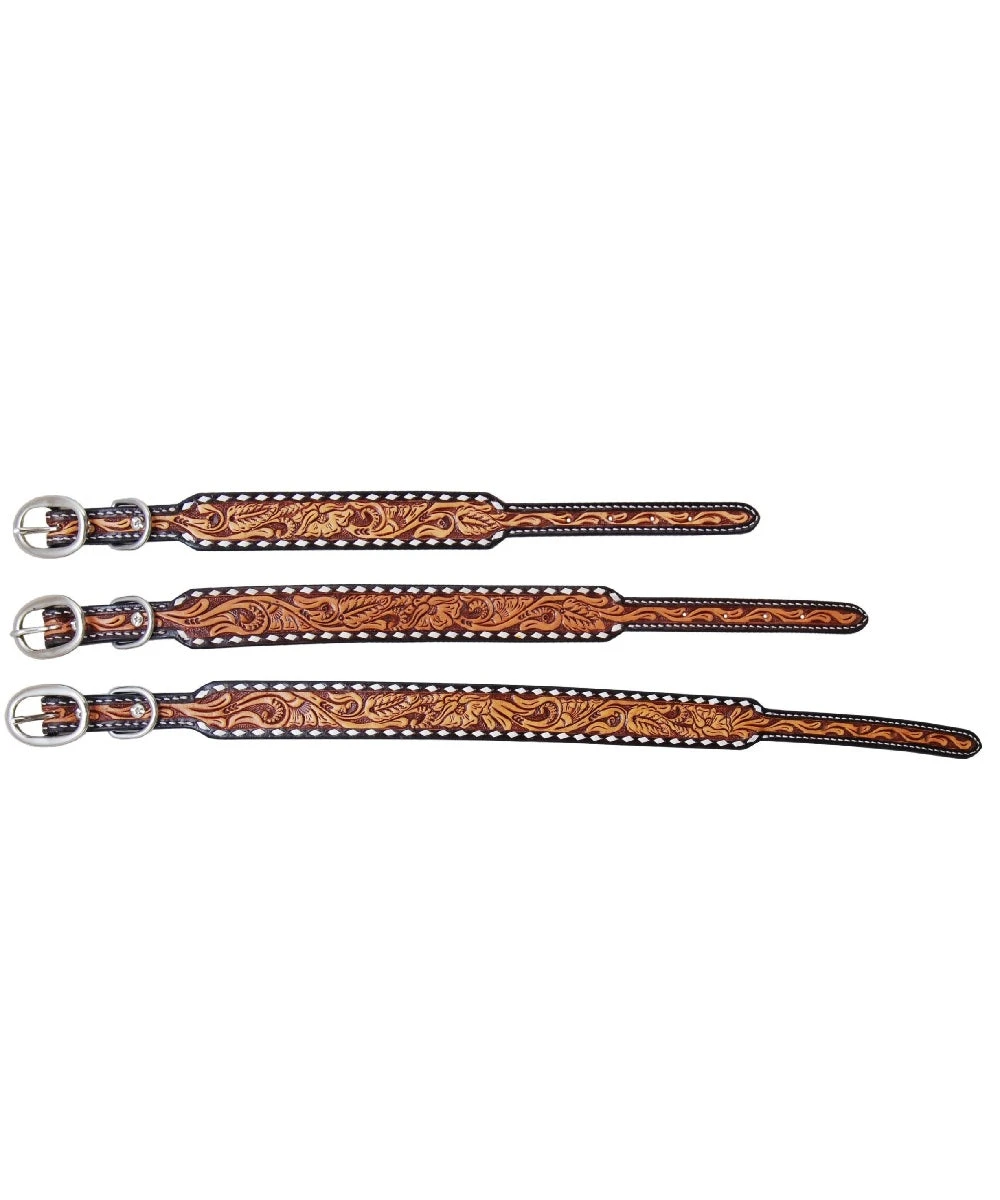 Leather; Stainless Steel Hardware; TT Finish; Tooled Details; White Buck Stitch Border; Size Small; Overall Length: 17 1/2″; Style #DC378-S