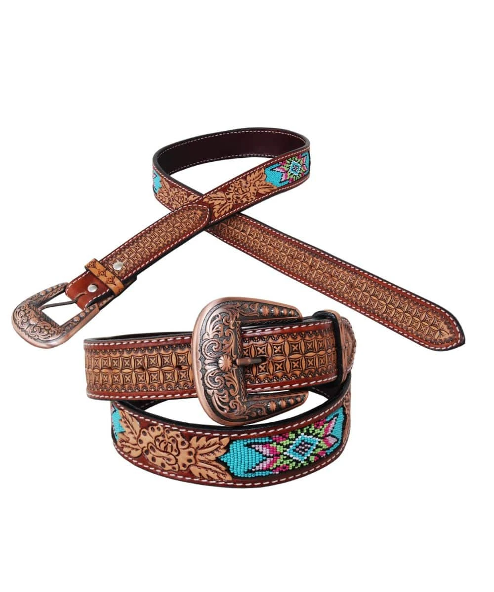 1.5″ Leather Belt; Beaded Inlay With Rose; Floral Tooling; TT Finish; SS Spots; Copper Buckle; Style #BT529