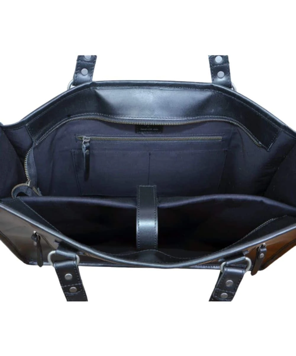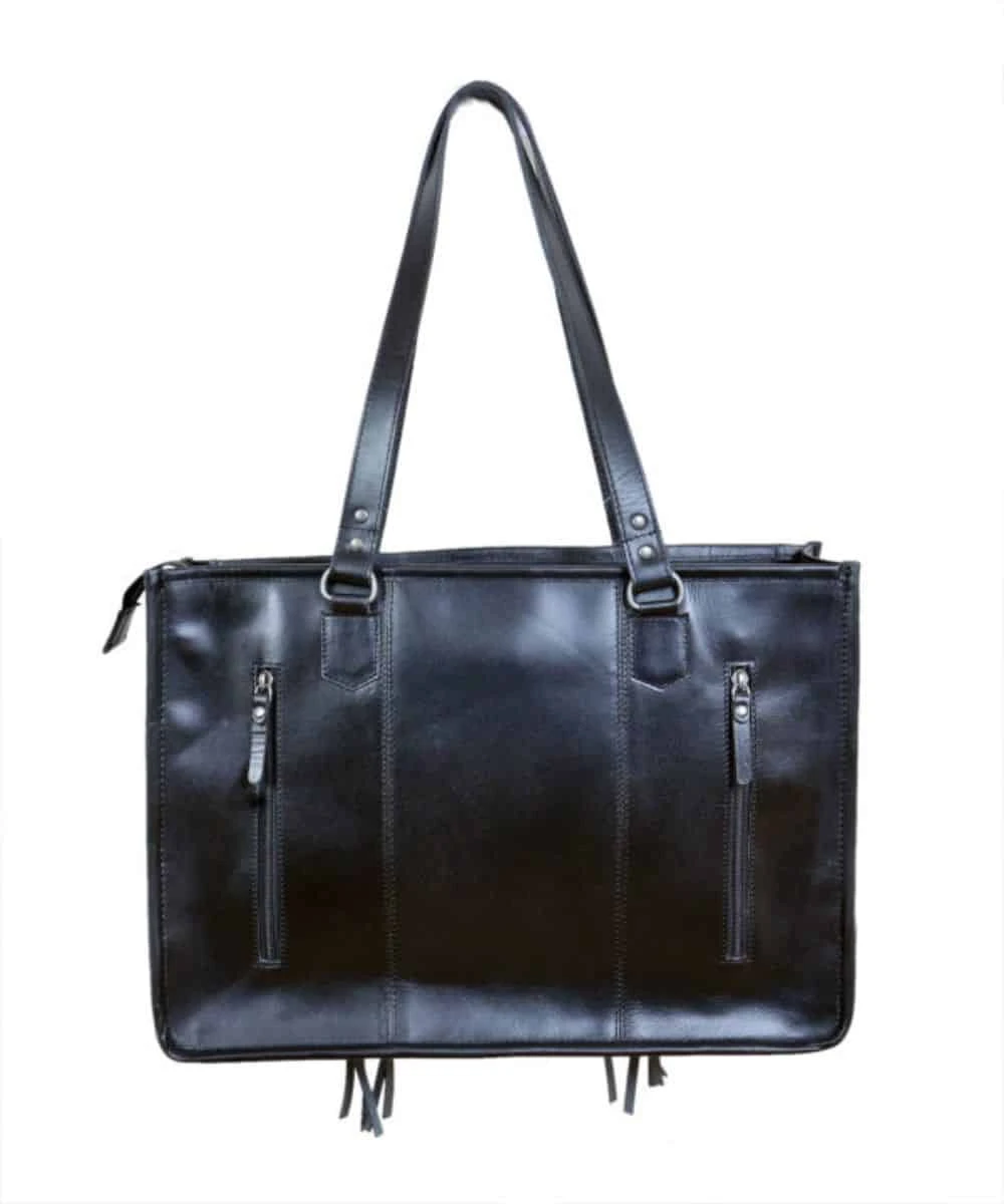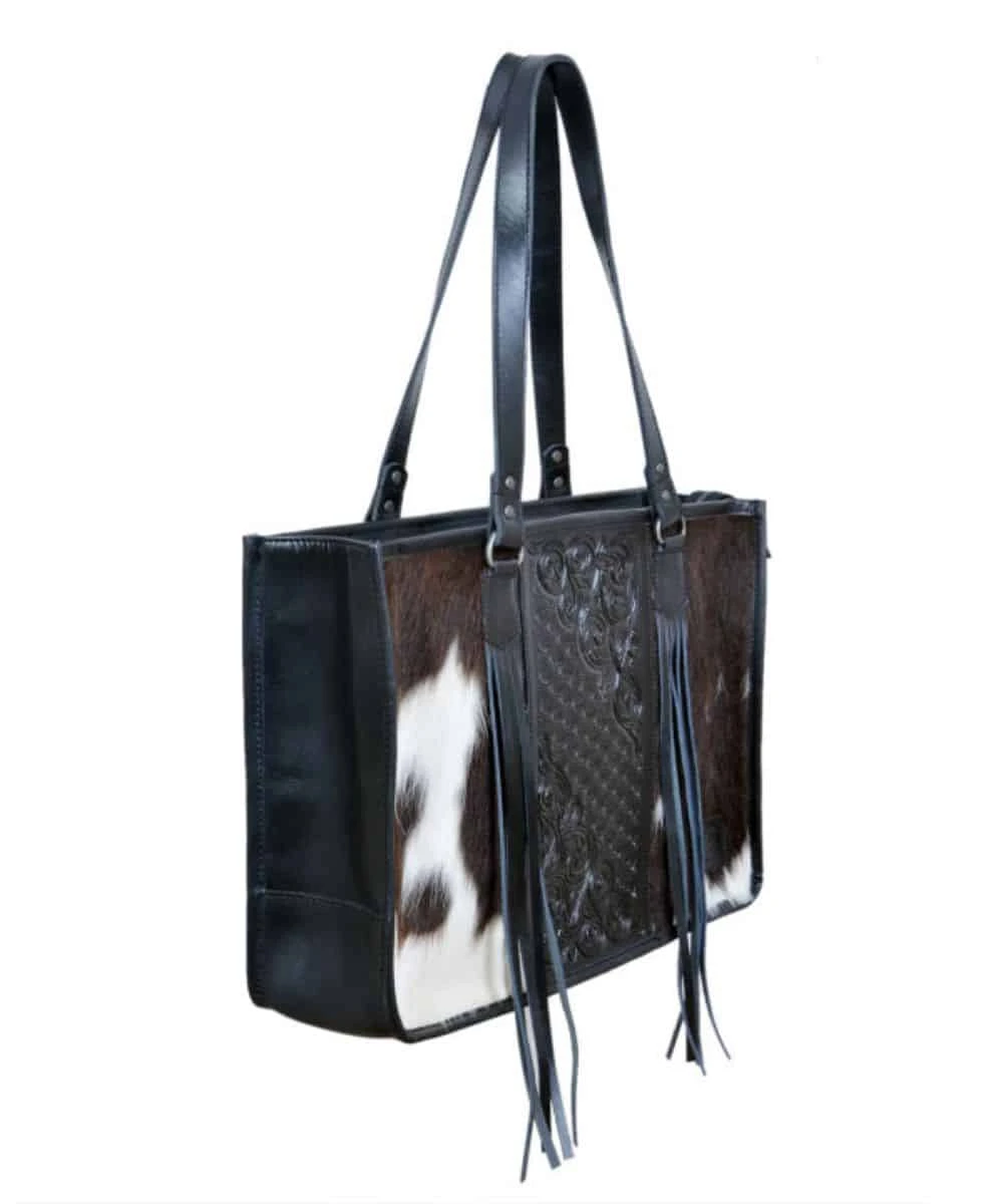 Black Tooled Leather; Black And White Hair On Hide; Black Fringed Tassels; Concealed Carry Pocket; Zipper Closure; Two Inside Compartments; Style #BL2409BW